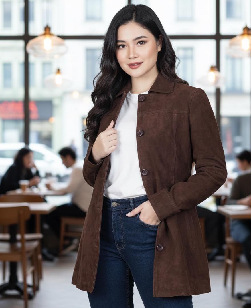 Abbraccia l'eleganza senza tempo con questo cappotto da donna in pelle scamosciata marrone cioccolat...