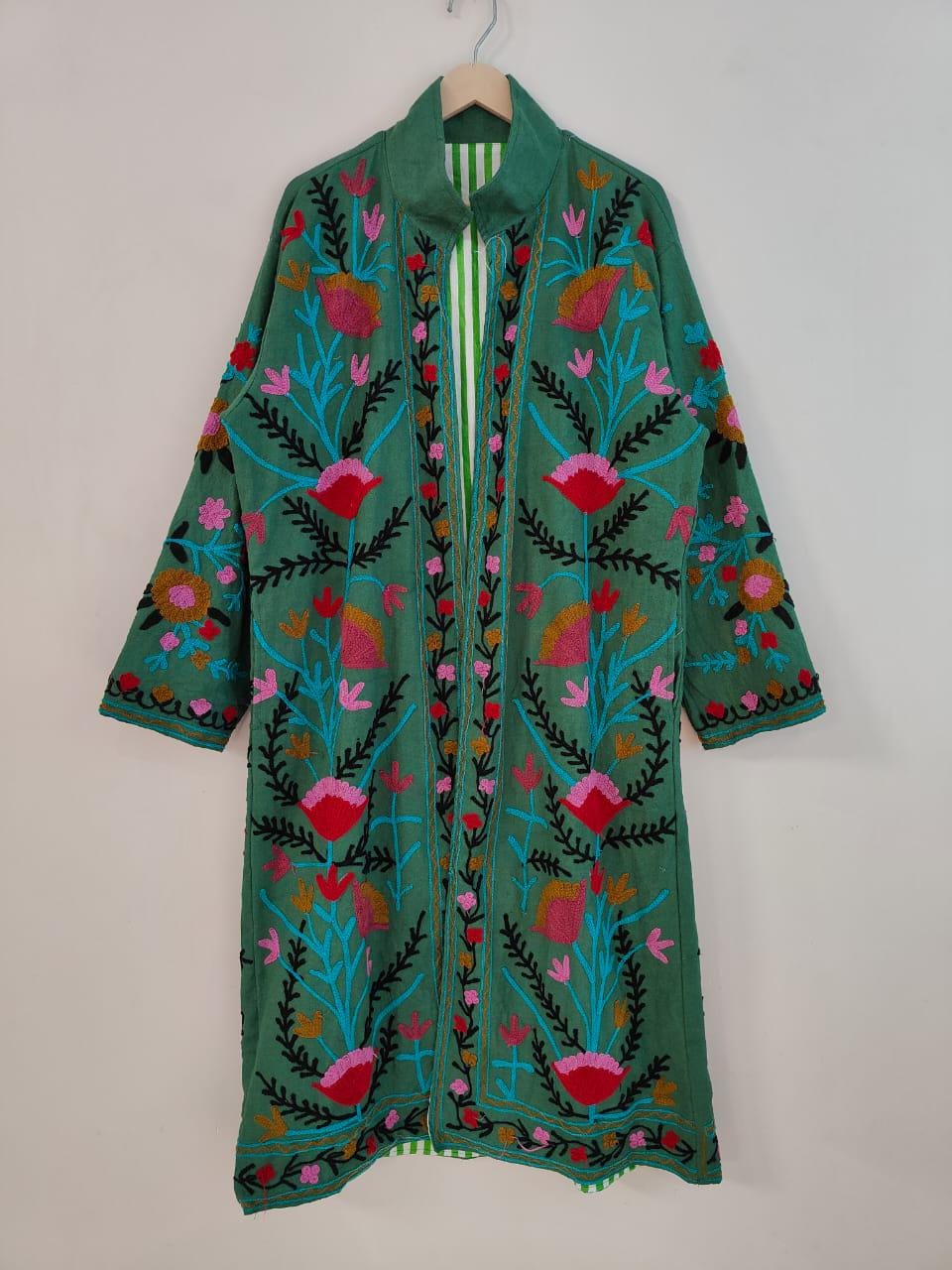 Green Long Linen Suzani Coat | Handmade Boho Embroidered Jacket | L...