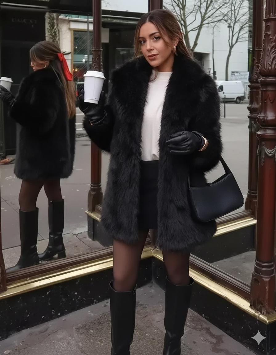 Stay warm and effortlessly stylish with this women's black faux fur winter coat, designed for a luxu...