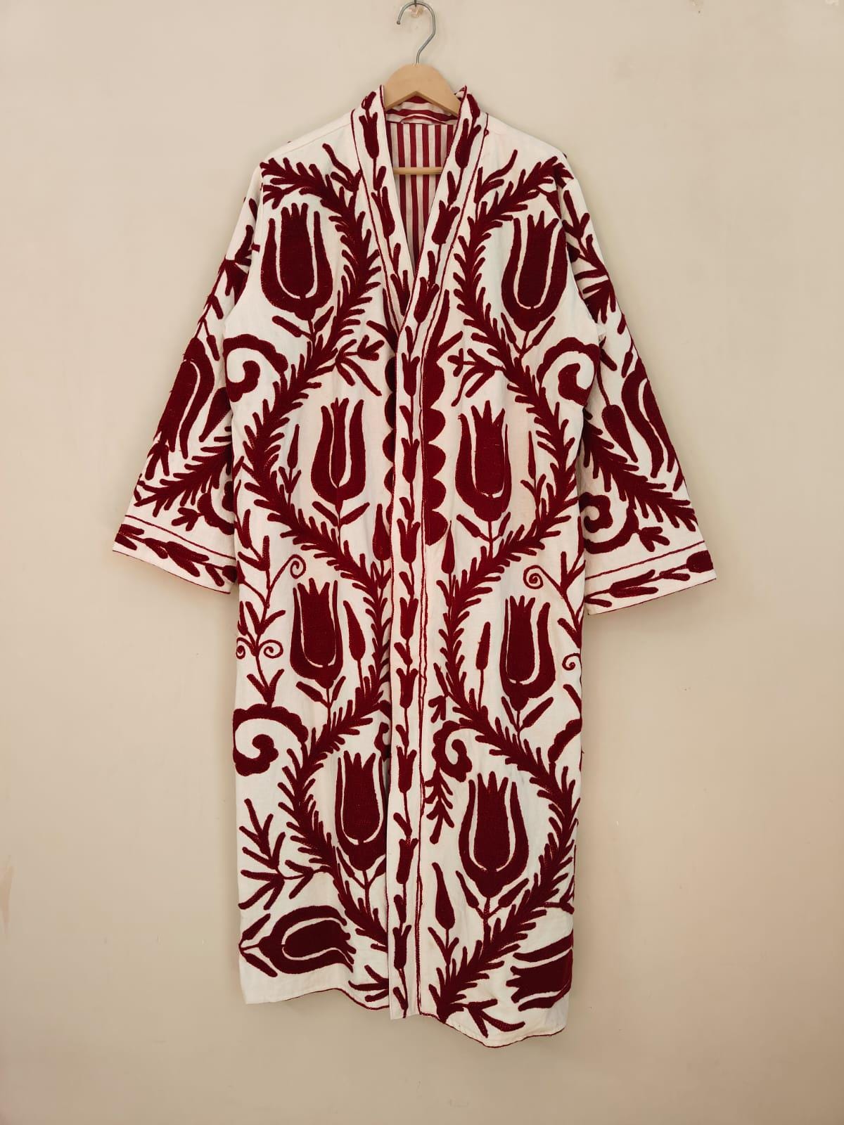 Long Coat, Handmade Suzani Kimono Robe | White & Maroon Floral ...