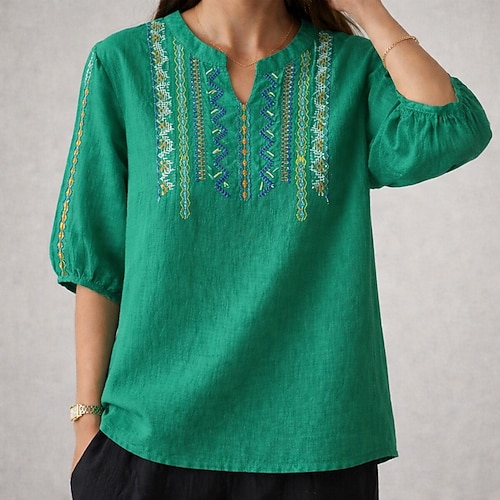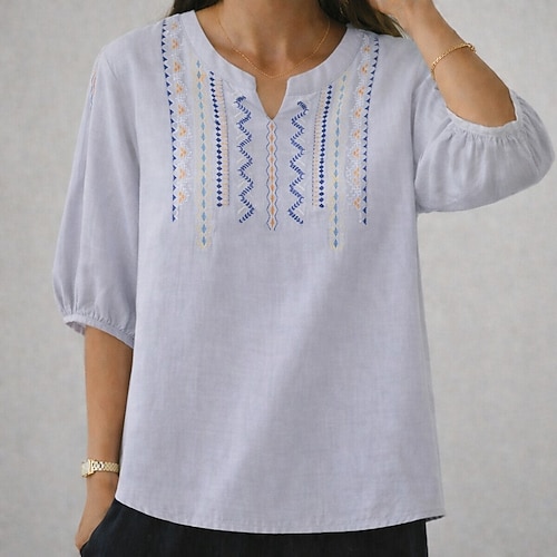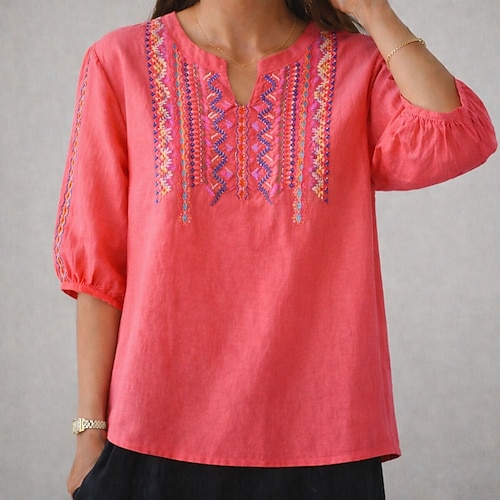 T-shirt boho da donna in cotone 100% camicia in lino T-shirt ricama...