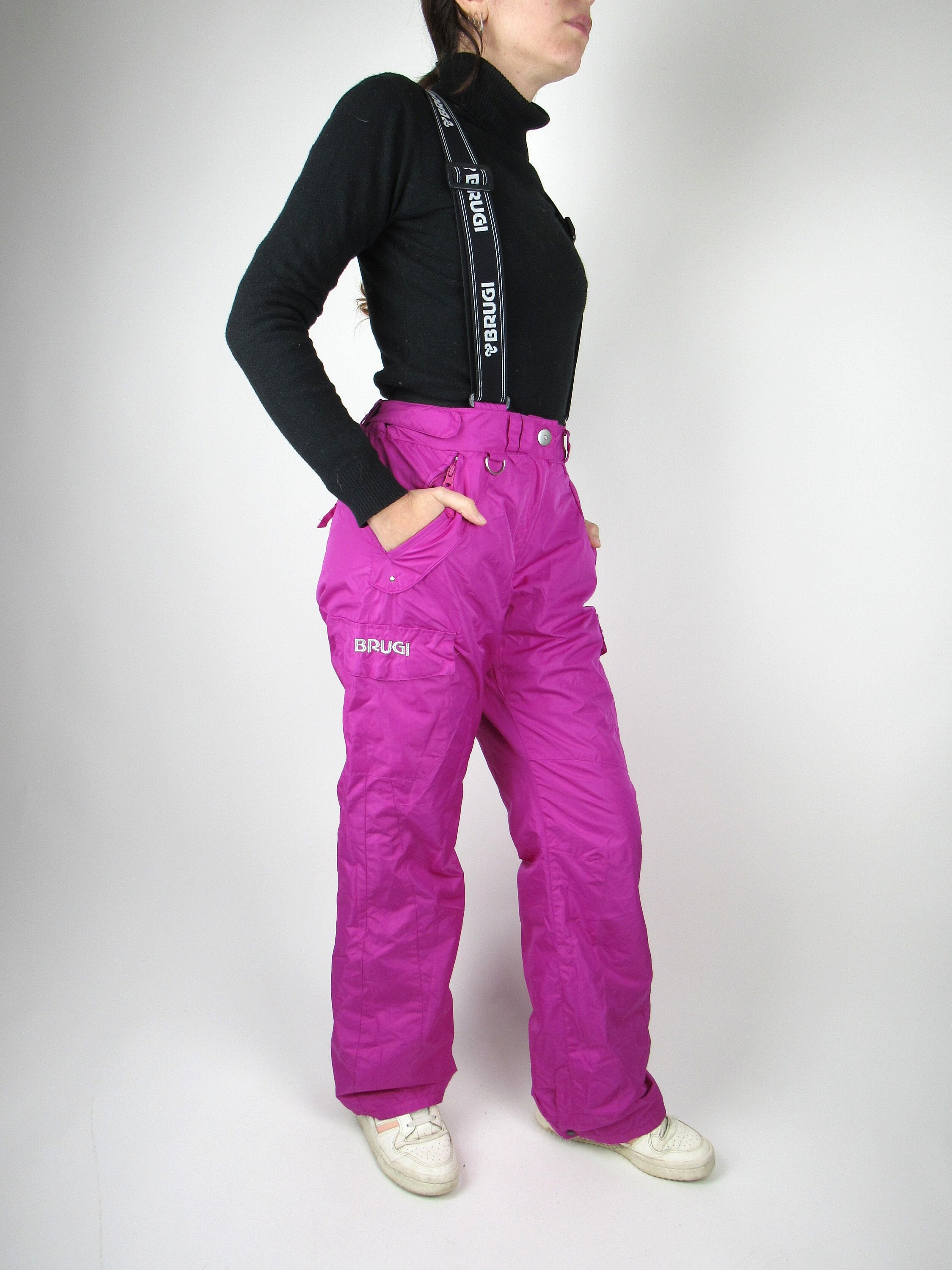 Pantaloni sci Brugi vintage anni '90, colore rosa, ha le bretelle regolabili e removibili, ha 4 tasc...