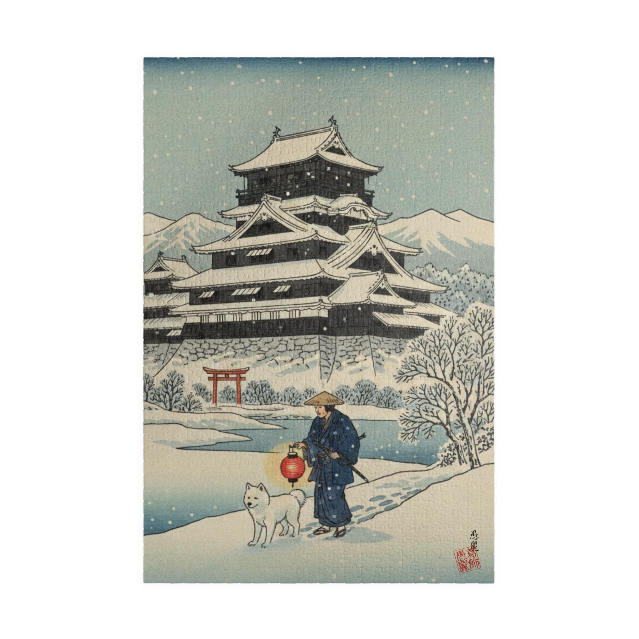 Puzzle Ukiyoe: Castello invernale, uomo e cane, 1014 pezzi