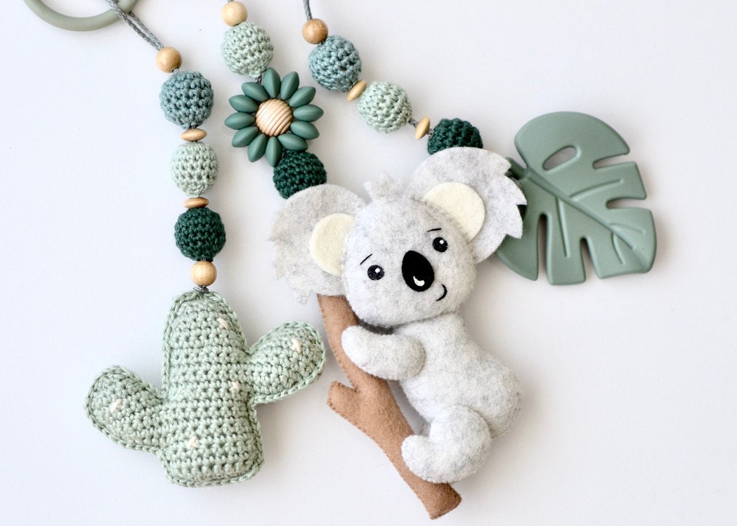 Incantevole arco da gioco con un simpatico koala in feltro, una foglia di monstera in plastica per a...