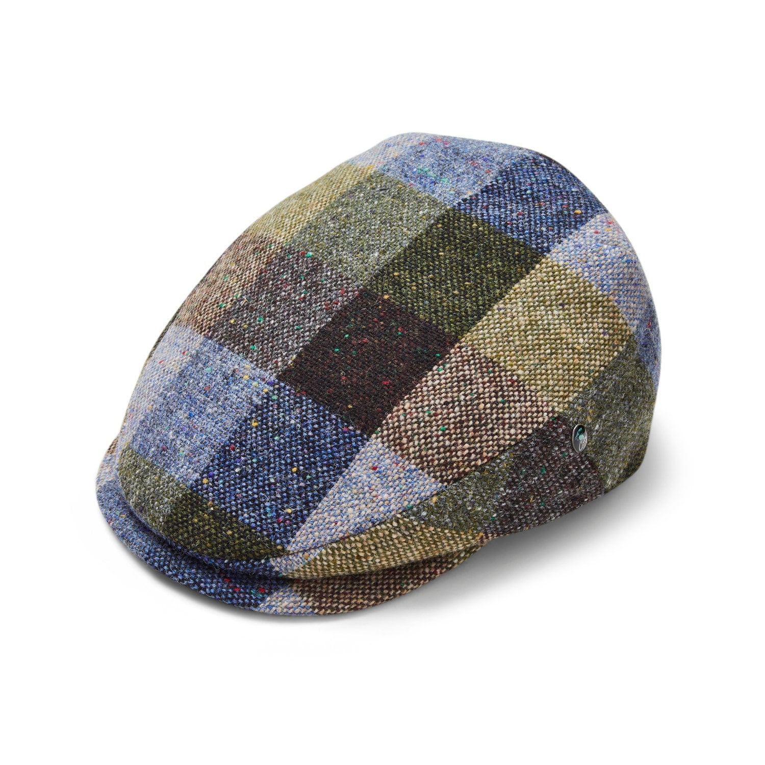 Vi presentiamo il nostro berretto piatto in tweed Donegal a quadri blu-verdi con visiera allungata, ...