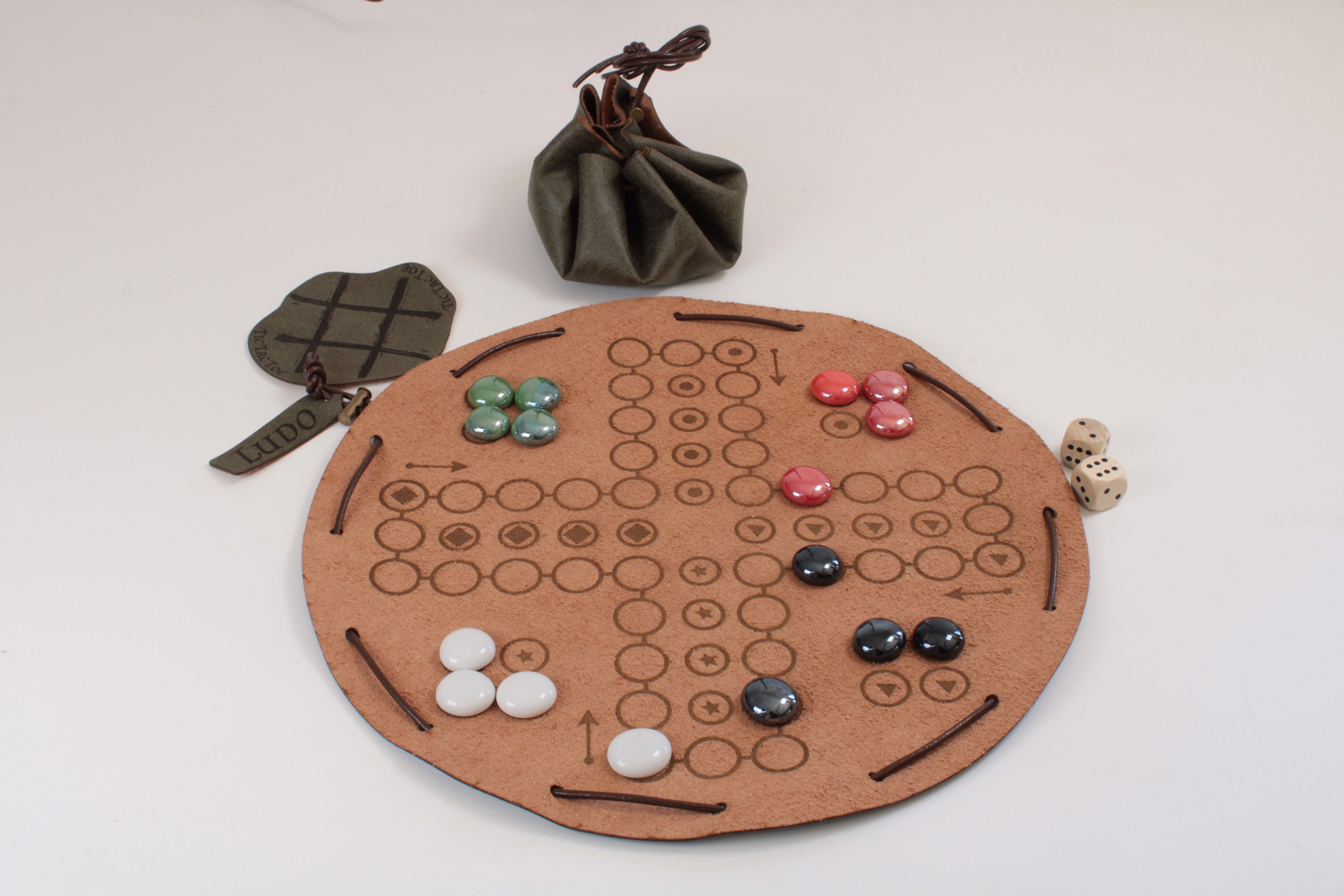 Gioco Ludo marchiato in una borsa in ecopelle contenente 16 pezzi di gioco in vetro. Riceverai anche...