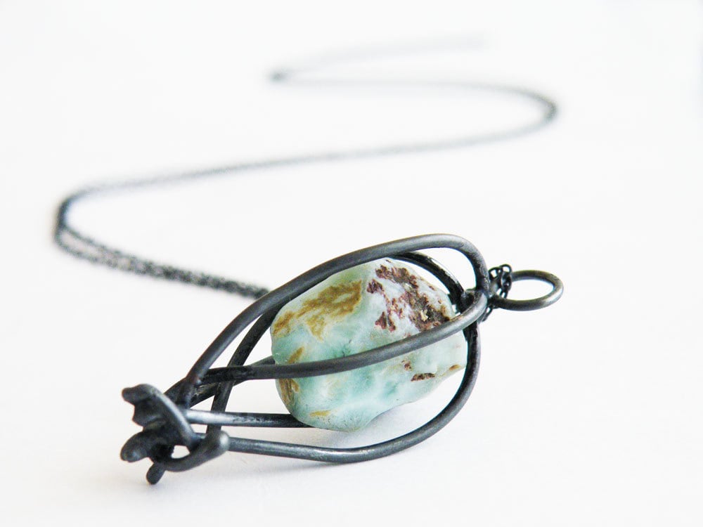 Questa collana con larimar grezzo è un pezzo molto affascinante. La gabbia ha uno stile rusti...