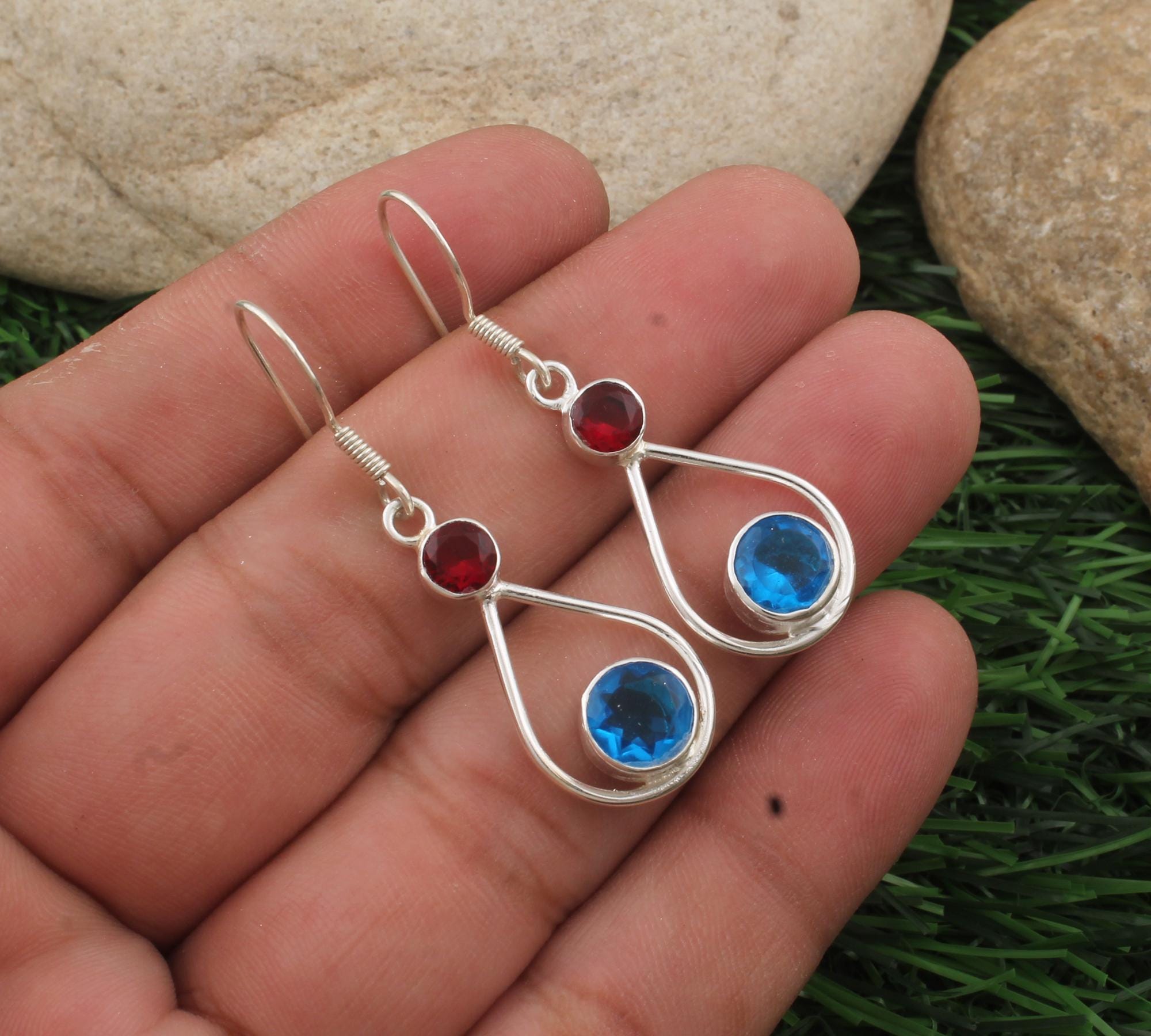 Orecchini pendenti con topazio blu e granato rosso: gioielli romantici in argento sterling #Regalo #...