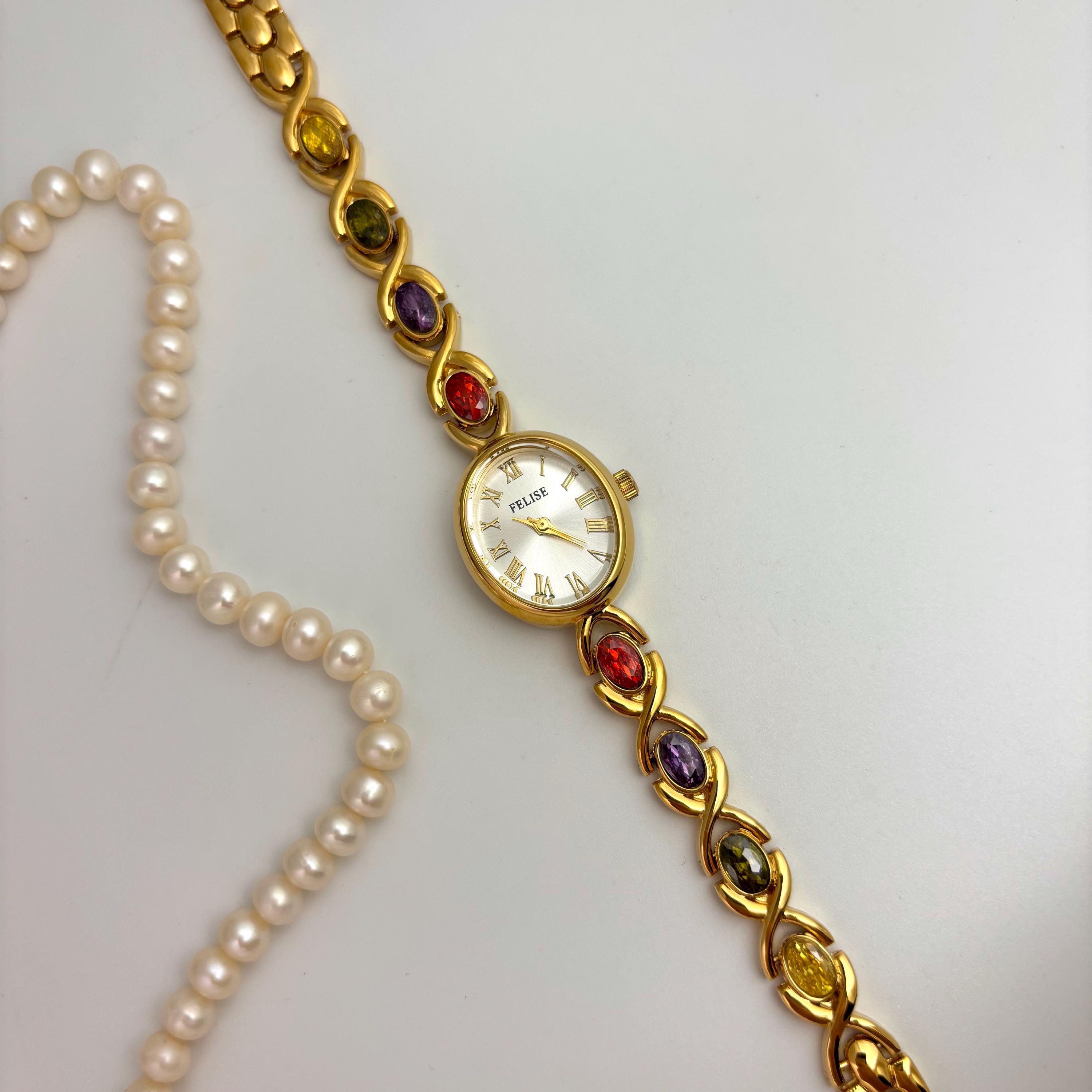 Orologio da donna vintage in oro con pietre preziose colorate, elegante quadrante con numeri romani,...