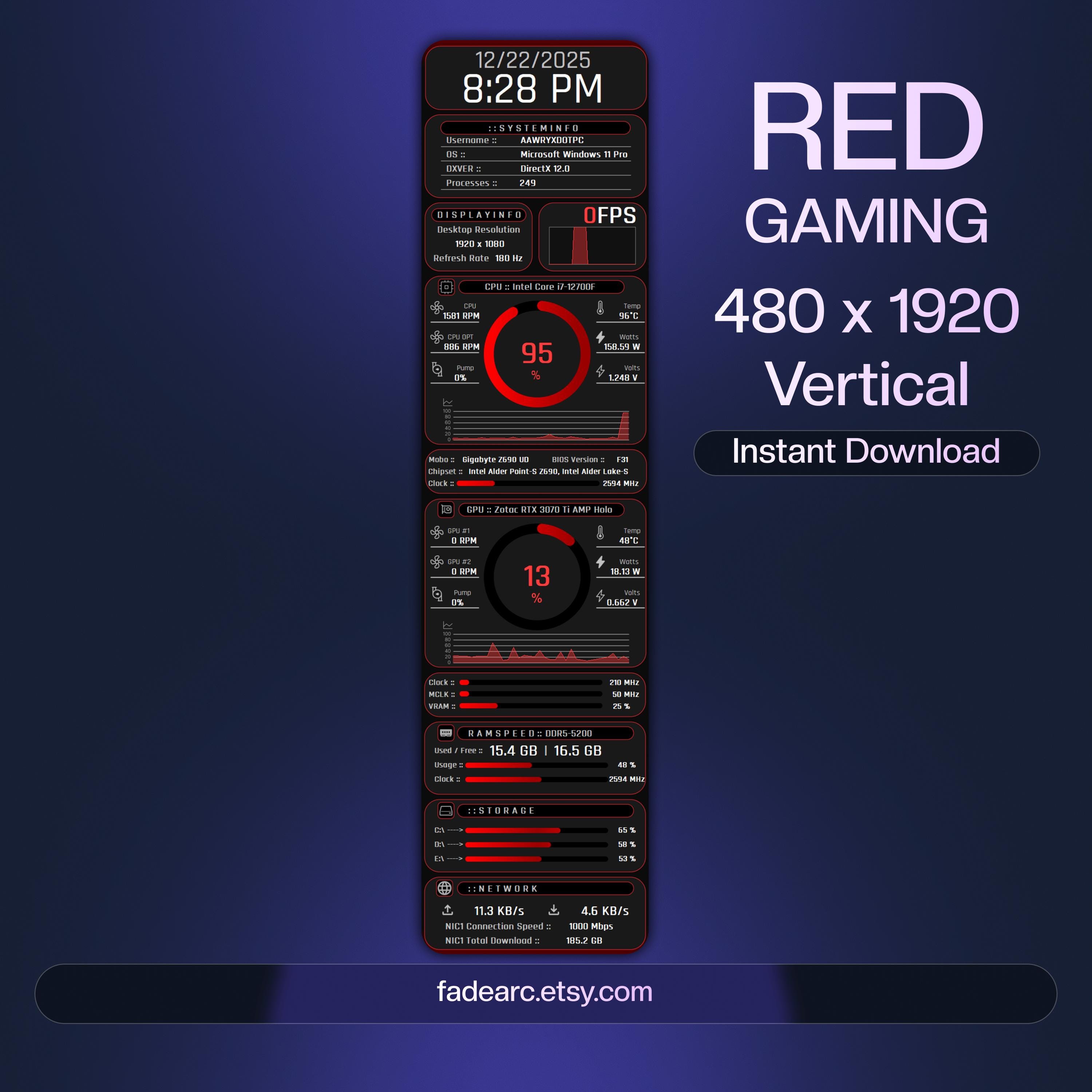 Pannello sensore AIDA64 480x1920 (verticale) / HUD gaming rosso / T...
