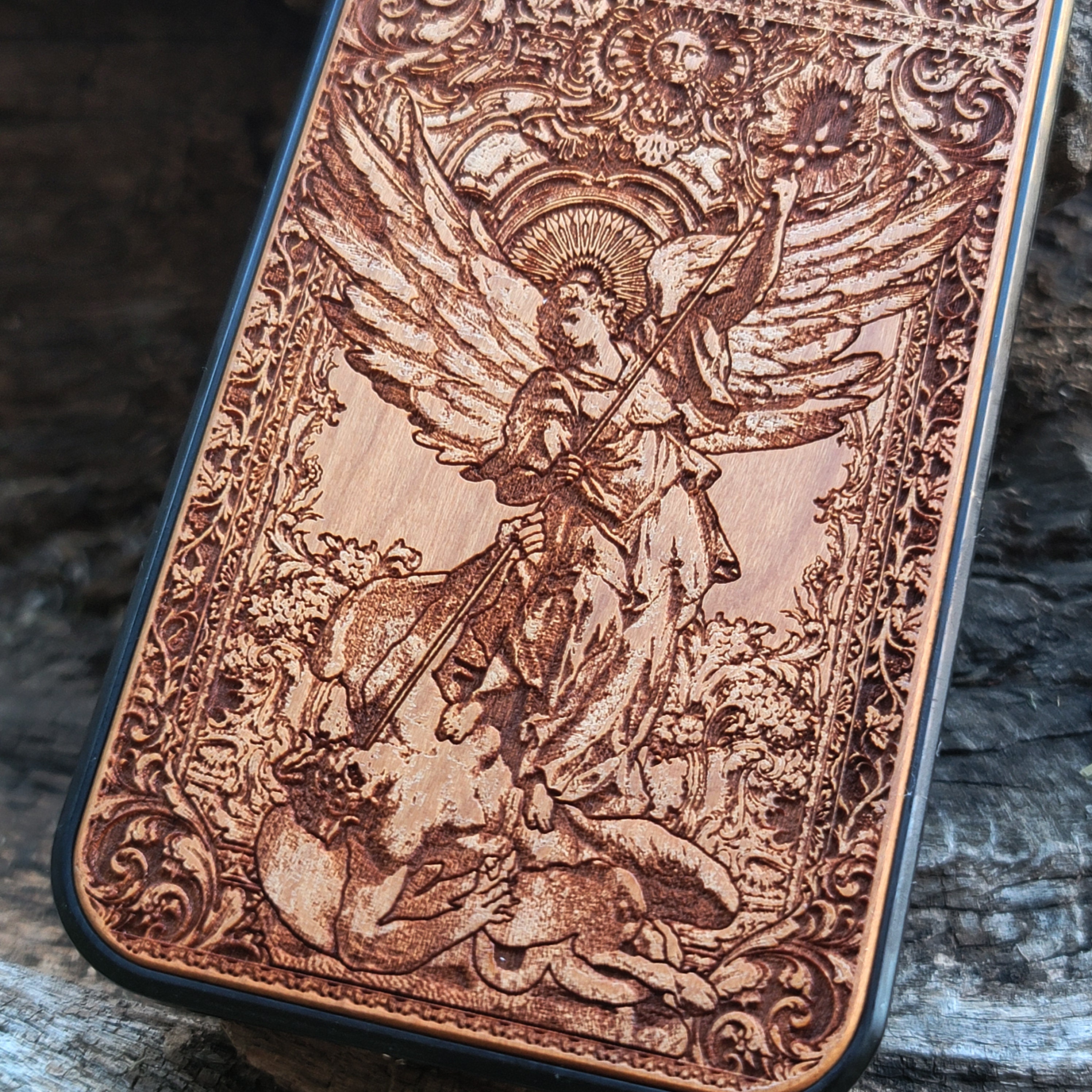 Custodia per telefono in legno intagliato al laser dell'Arcangelo M...