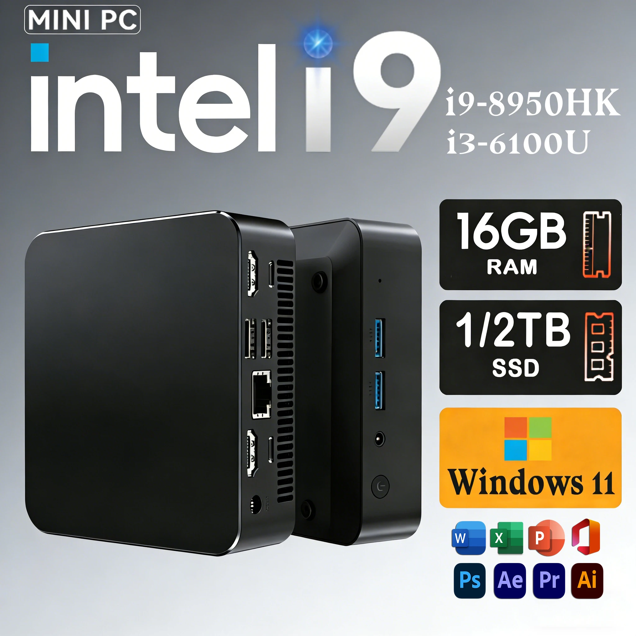 Mini PC Intel Core i9-8950HK/i3-6100U con Windows 11, 16GB di RAM, SSD da 1/2TB, supporto per 3 sche...