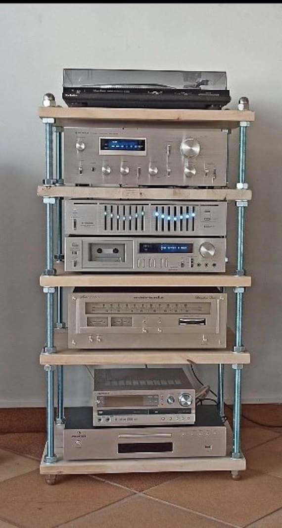 Mobile per impianto hi-fi di alta gamma in legno massello e barre filettate in stile design industri...