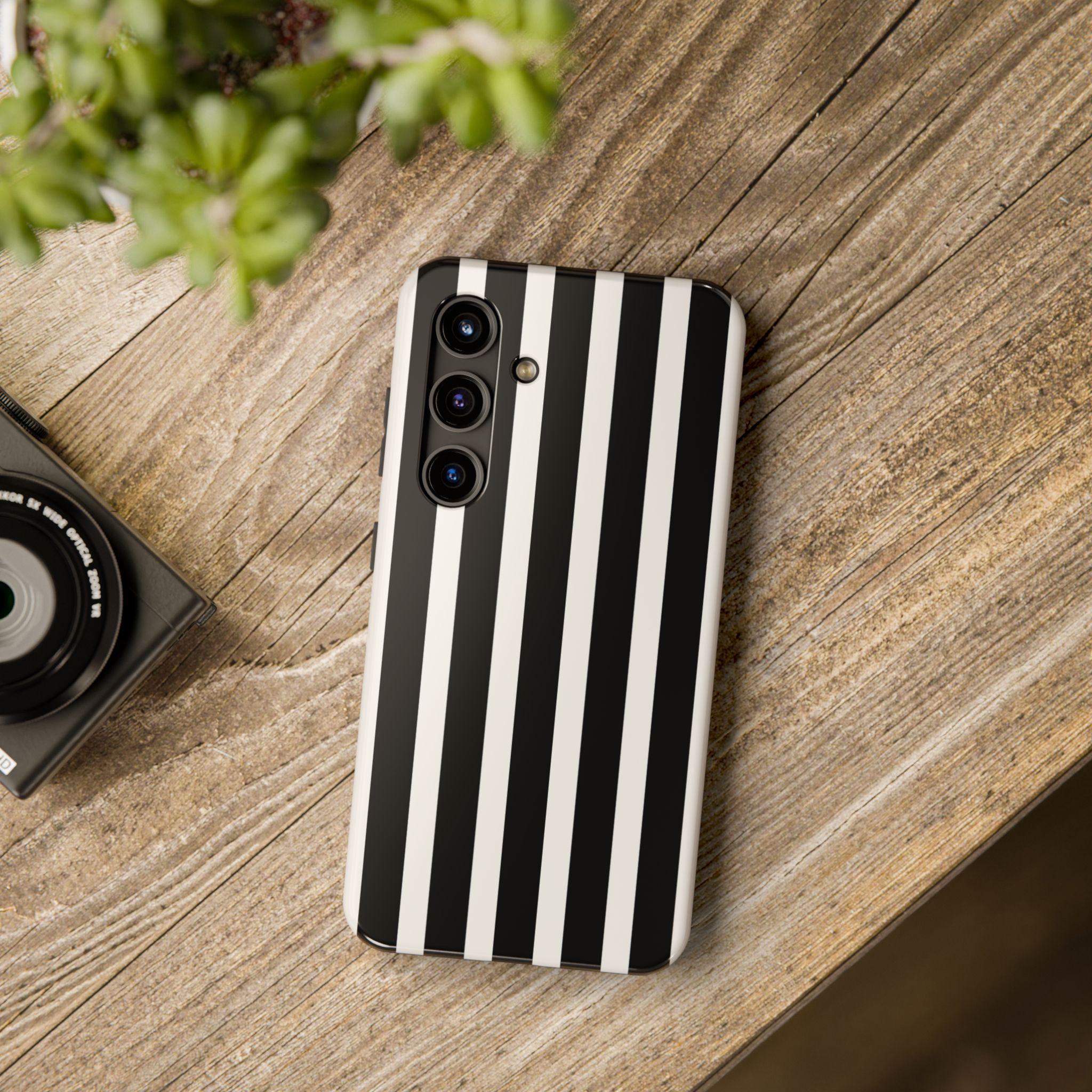 Questa custodia per telefono a righe bianche e nere presenta linee verticali decise in un design mon...