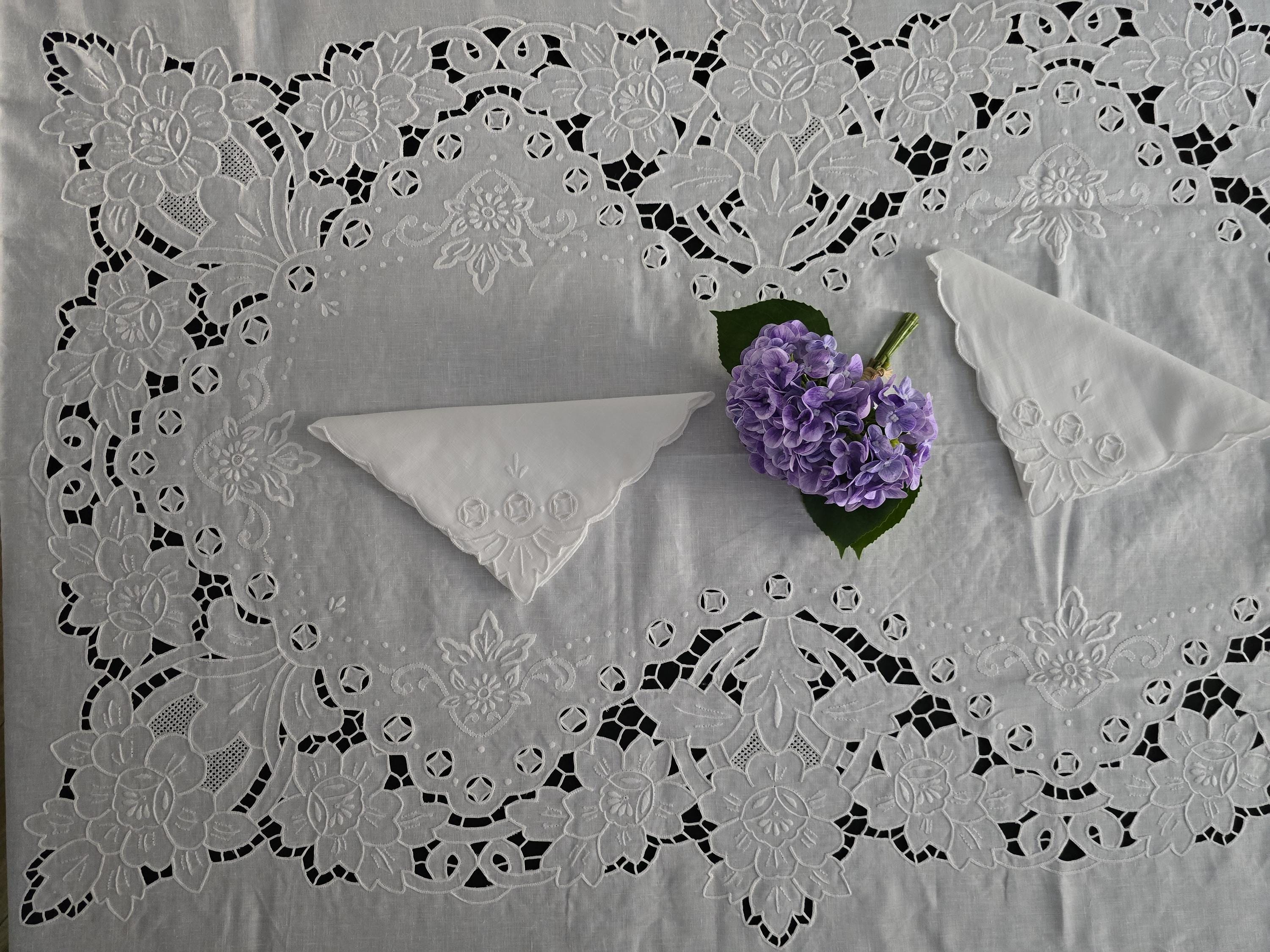 Tovaglia 12 posti puro lino ricamata a mano ricamo intaglio 170x 26...