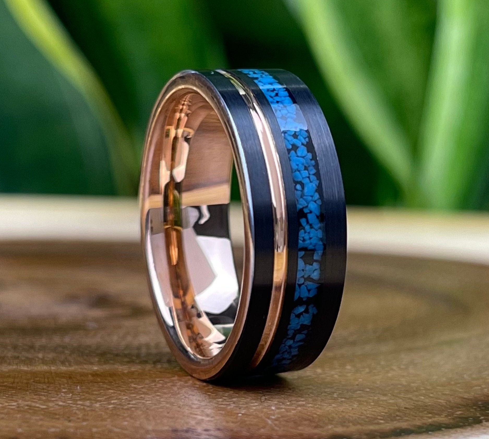 "Anello da uomo in tungsteno con turchese frantumato, anello da donna in oro rosa, anello da ma...