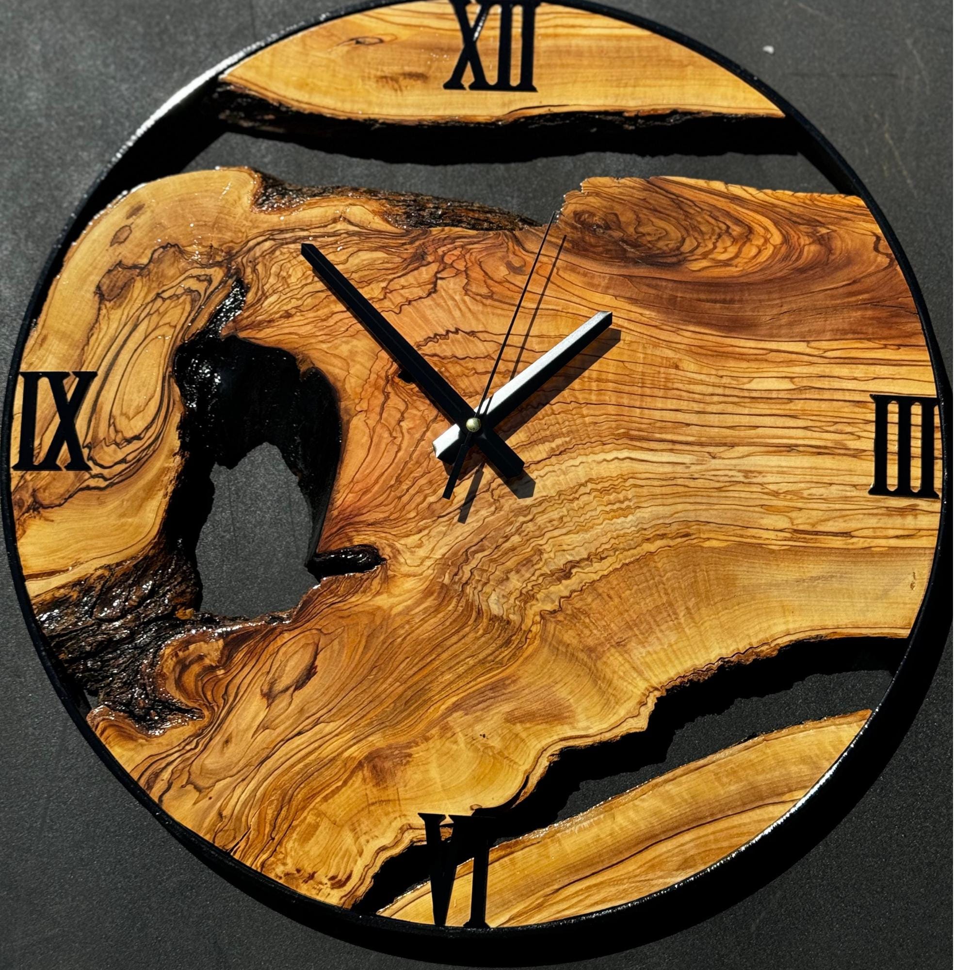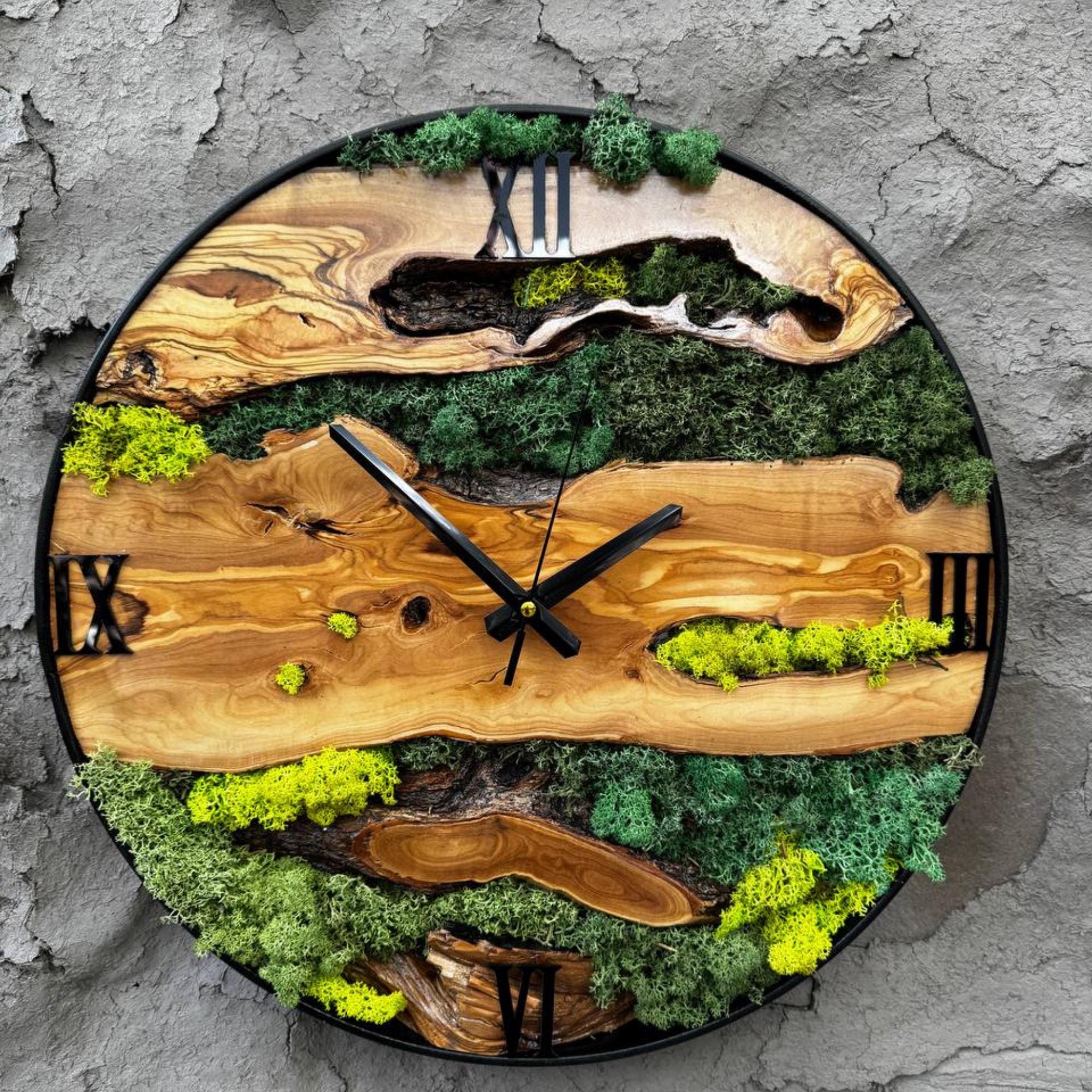 Decorazione da parete in legno d'ulivo e muschio, orologio da paret...