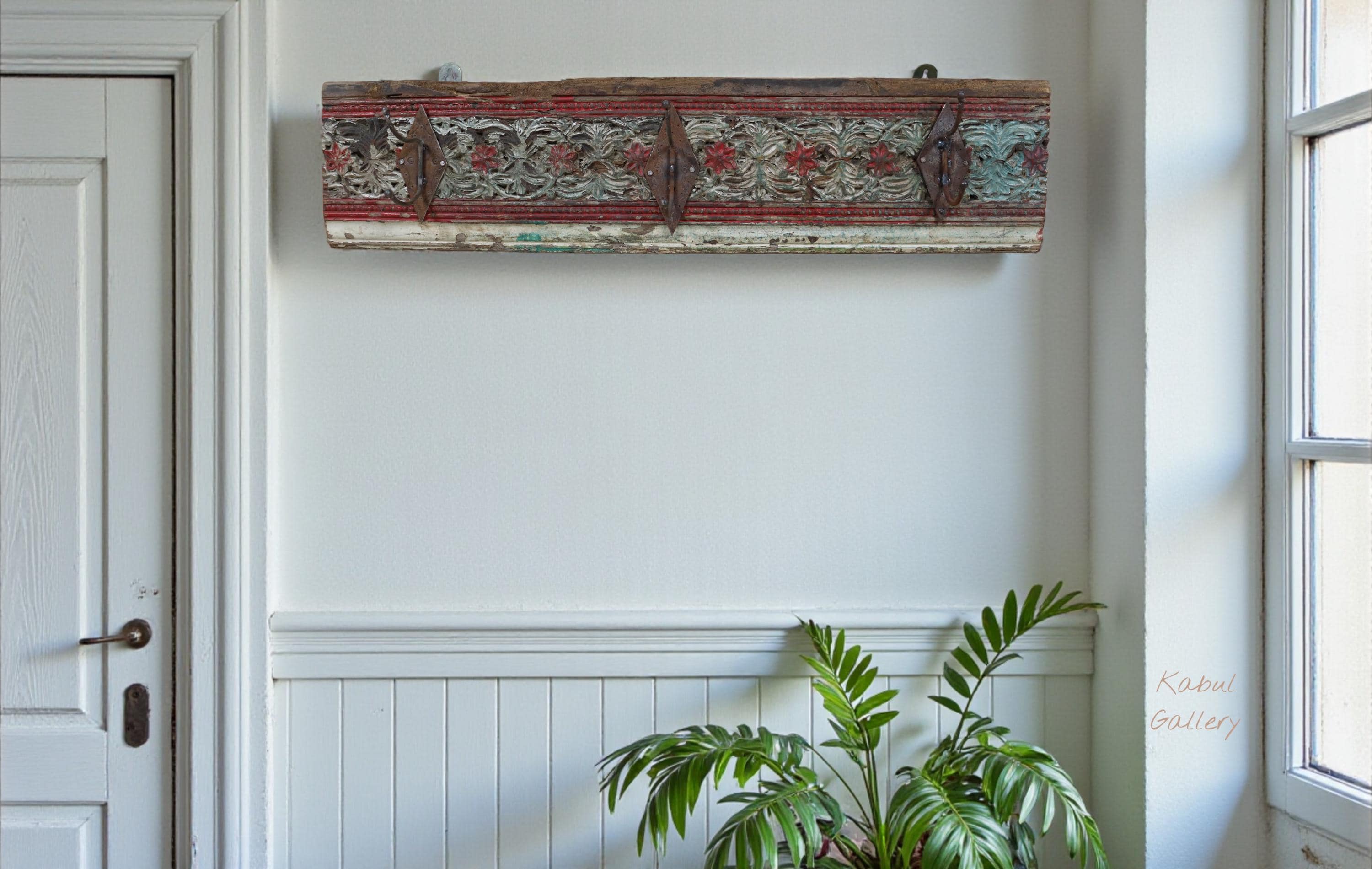 Un appendiabiti realizzato con un pannello di legno antico proveniente dal Nuristan, Afghanistan, co...