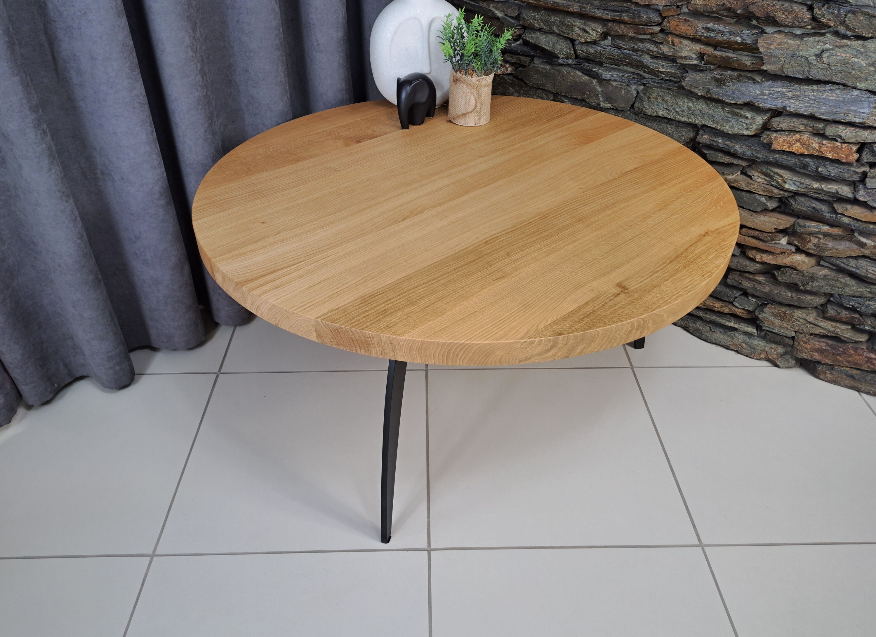 Tavolino rotondo realizzato interamente in legno di rovere accuratamente selezionato con venature be...