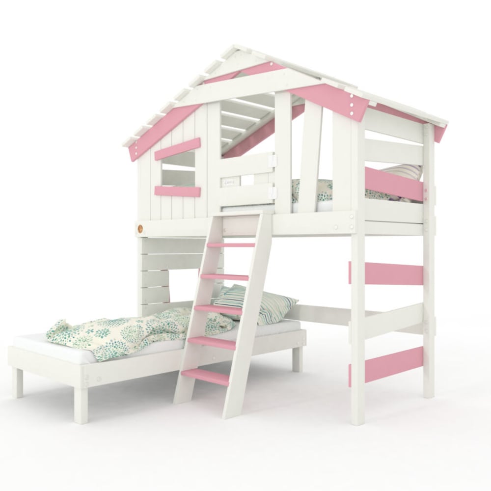 Letto a soppalco con letto inferiore in pino, bianco/rosa