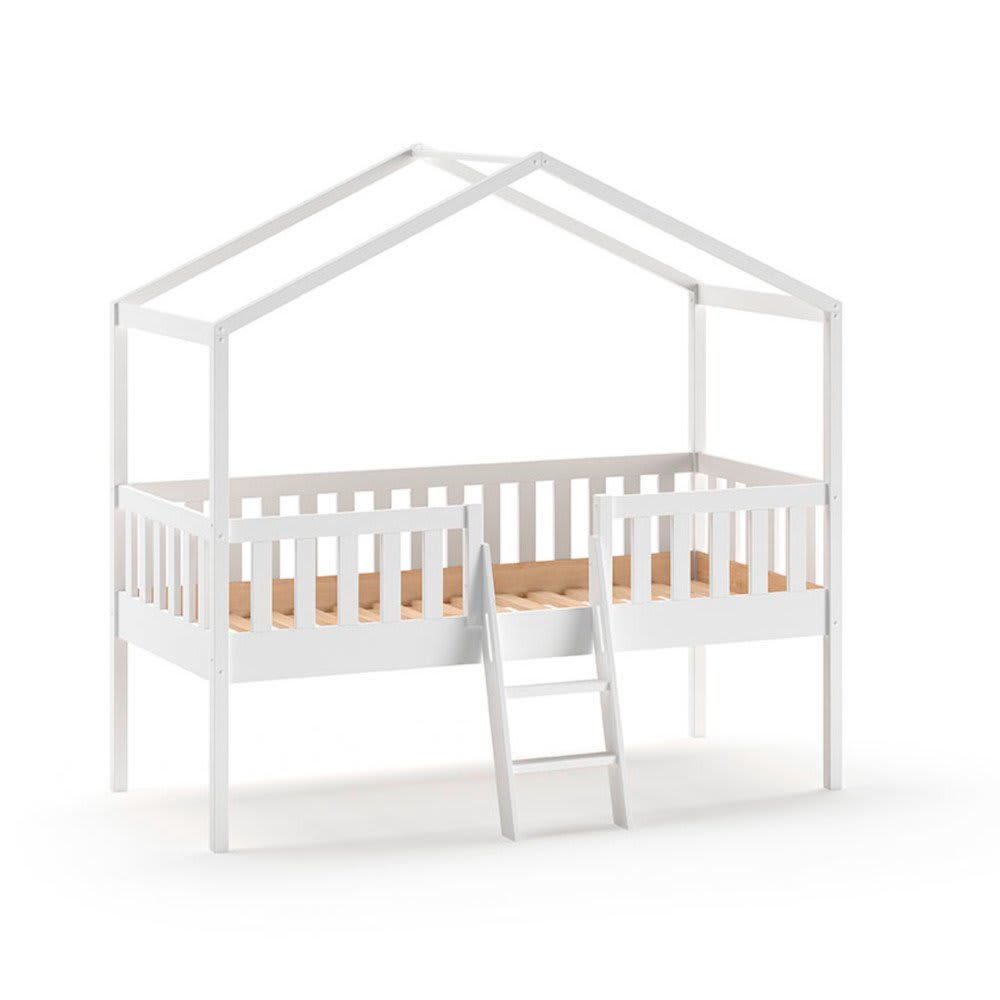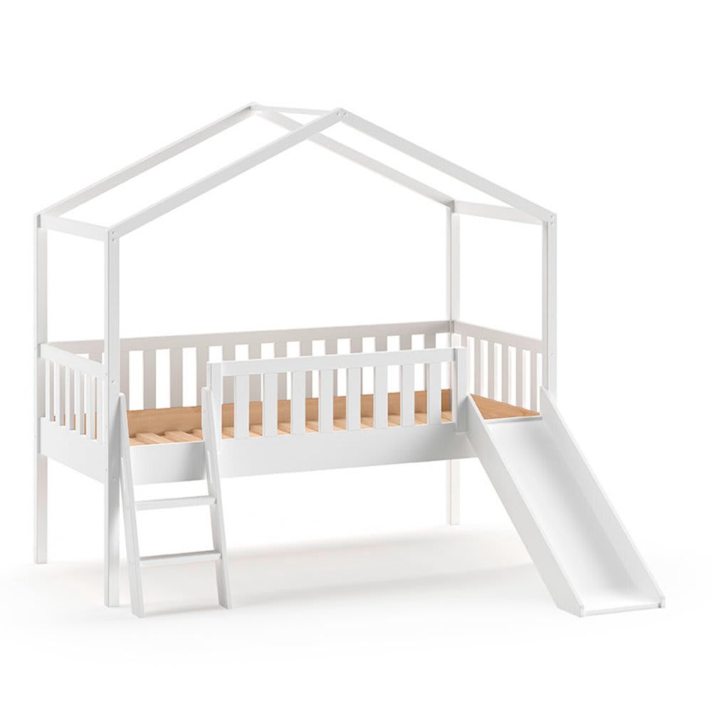 Letto a casetta rialzato con scivolo, effetto legno bianco, 90x200