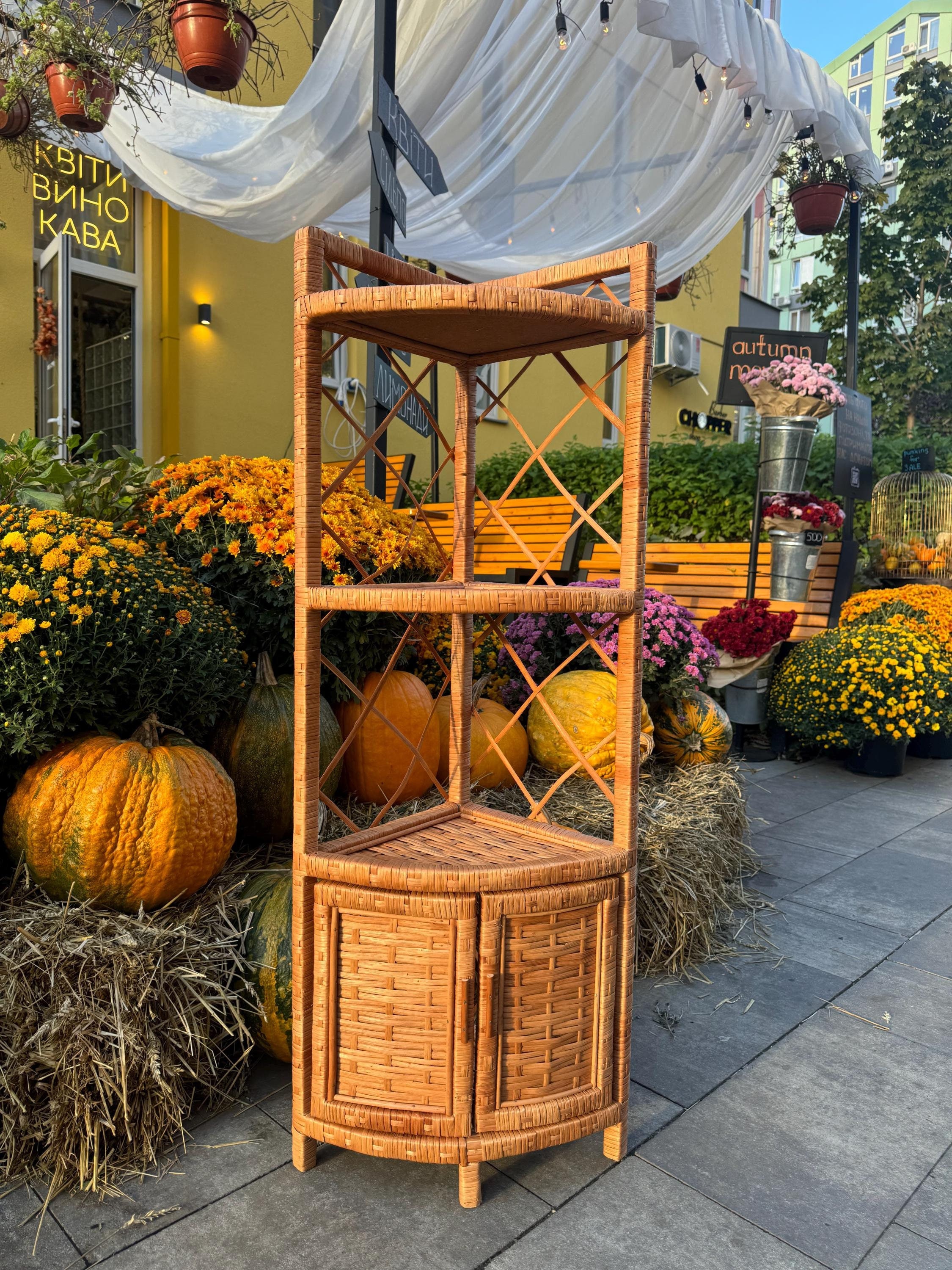 Mobiletto angolare con ante, libreria in vimini, mobili boho, mobil...