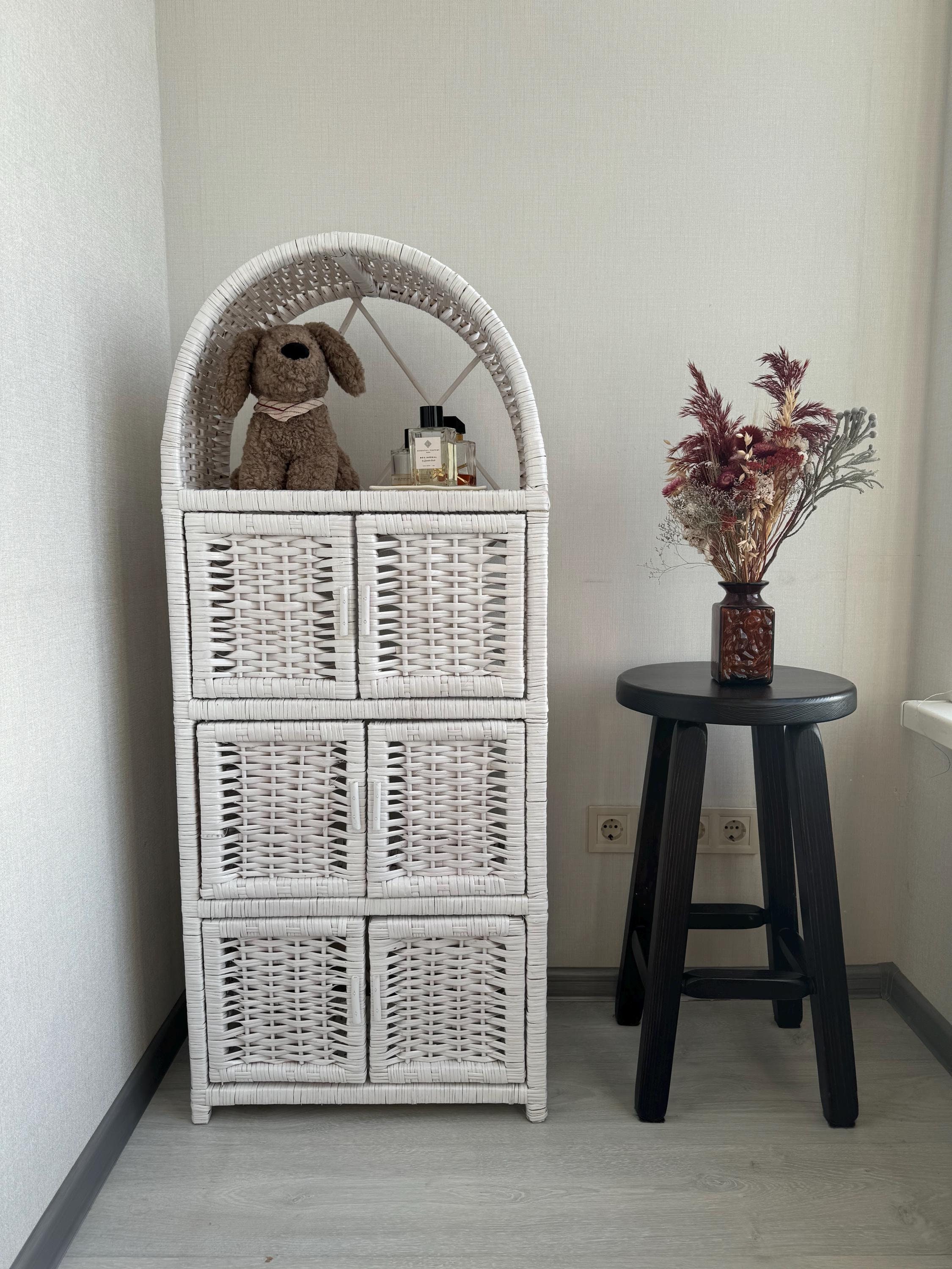Mobiletto ad arco con ante, libreria in vimini, mobili boho ecologi...