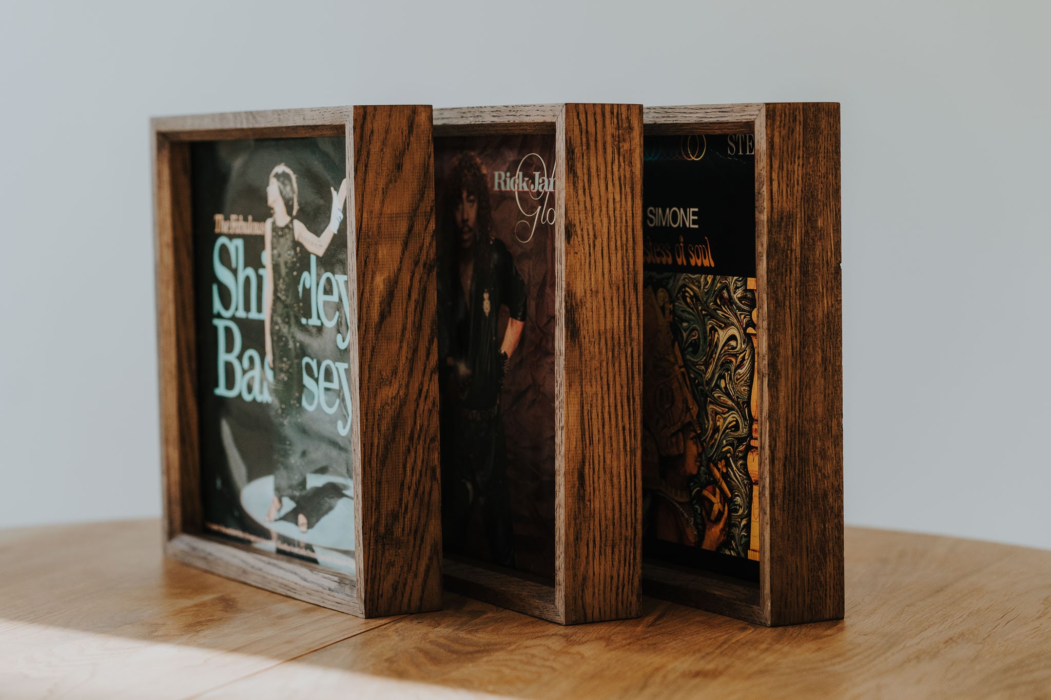 Set di 3 porta dischi in vinile in legno di quercia / espositore pe...