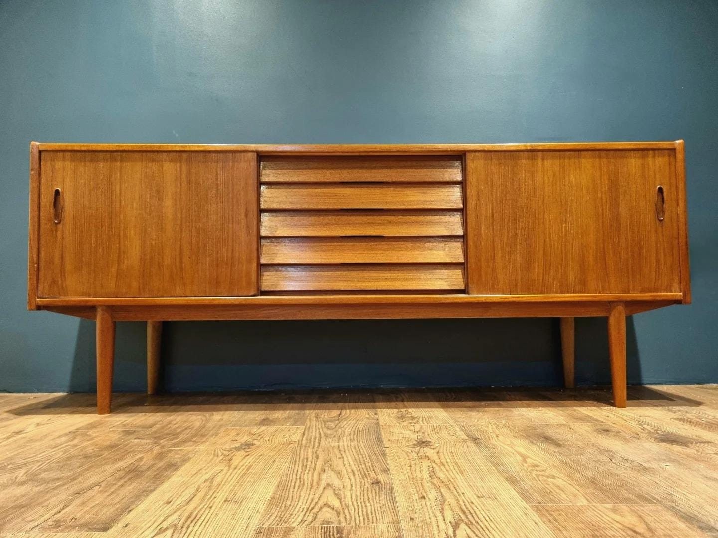 Mobile TV in noce di metà secolo con ante scanalate e ripiani aperti, mobile porta TV curvo d...
