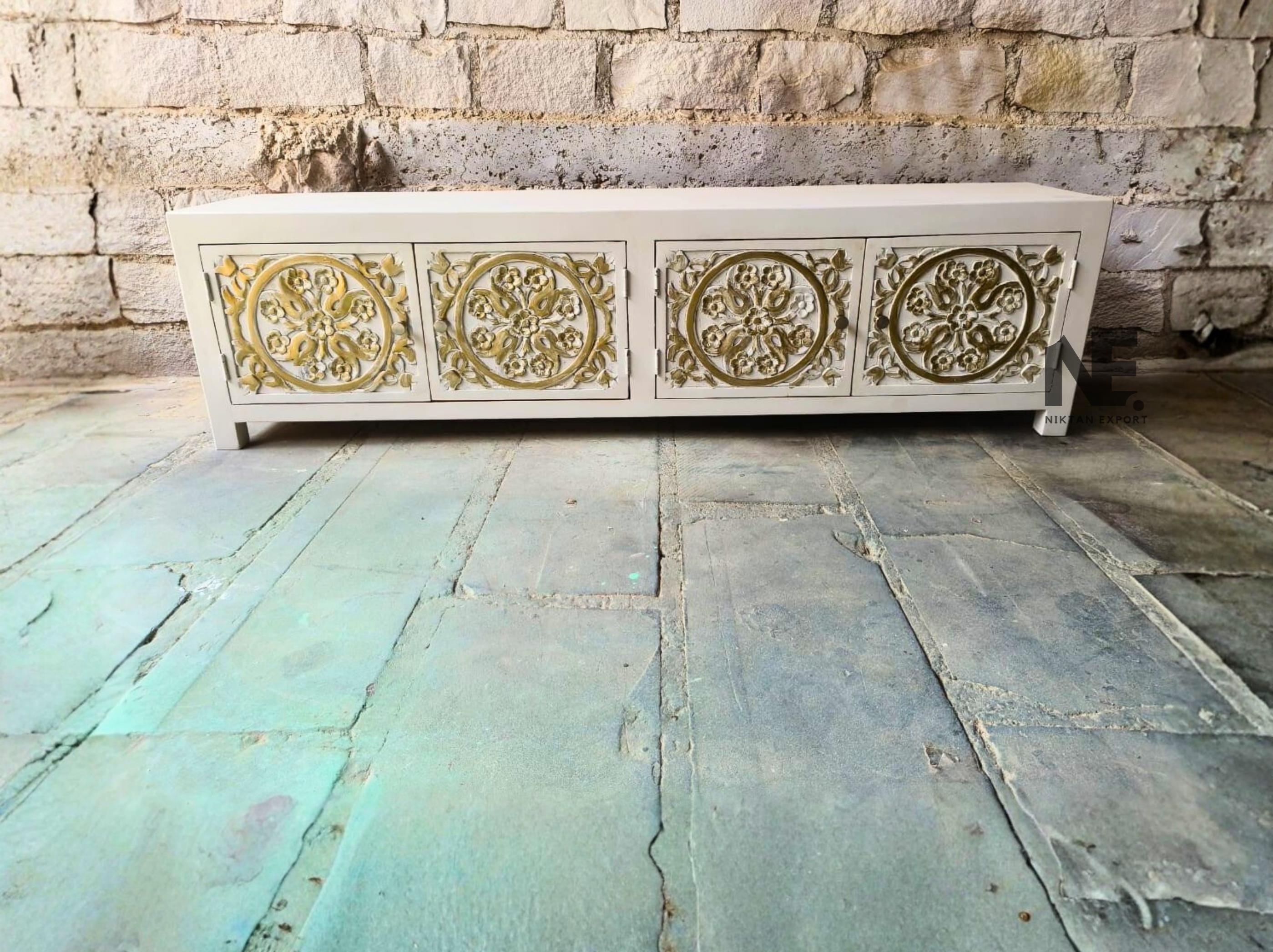 Mobile TV floreale intagliato a mano: mobiletto porta TV indiano, m...