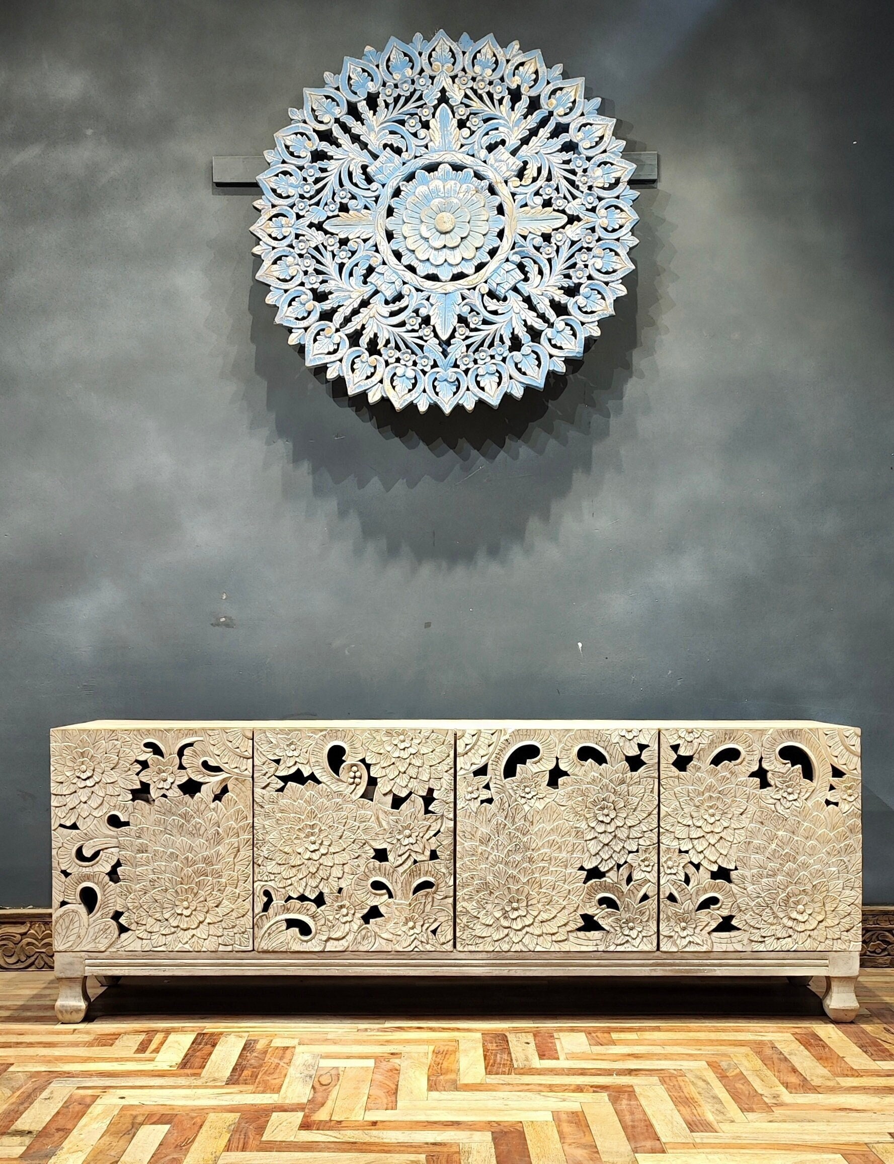 Vi presentiamo il nostro mobile porta TV in legno intagliato a mano con motivo floreale. Immergetevi...