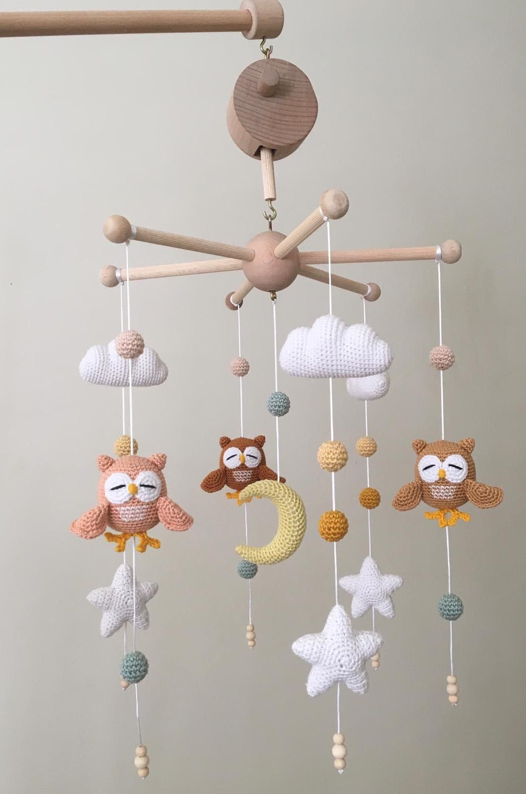 Mobile per neonati all'uncinetto a forma di gufo, mobile per culla con carillon, mobile per culla pe...