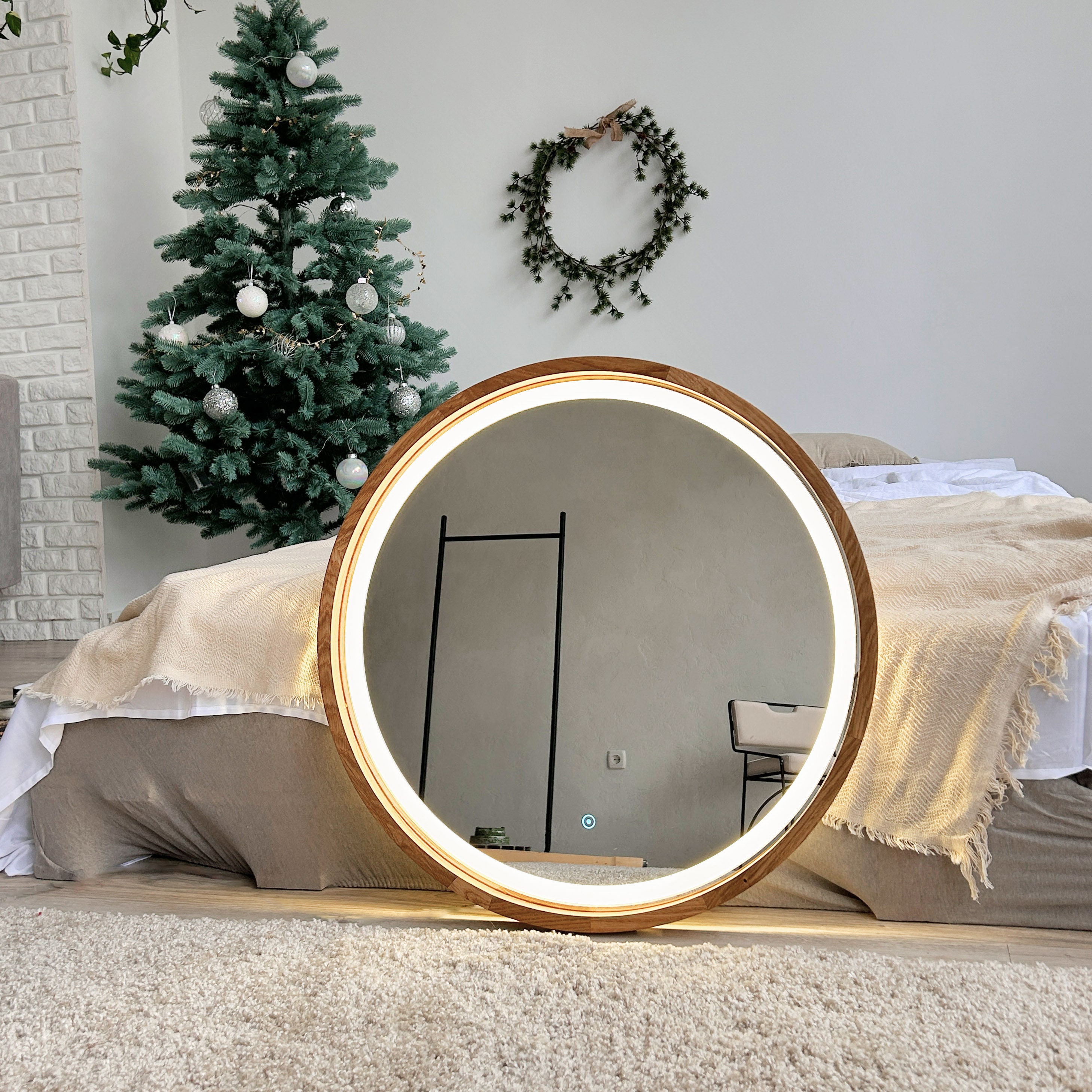 Specchio LED rotondo, specchio in legno, luce LED, specchio da bagn...