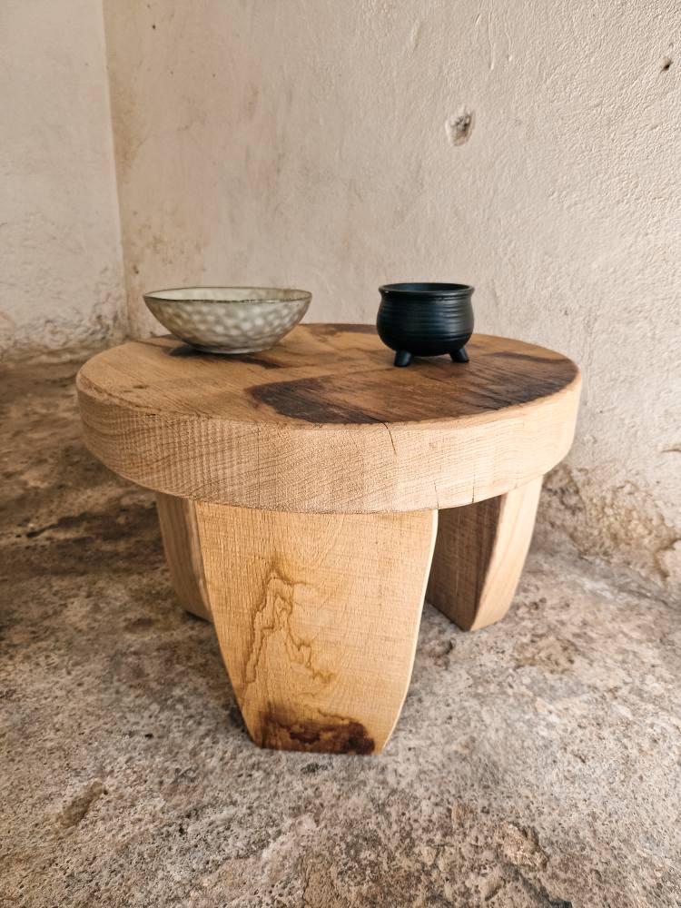Il tavolino rotondo Wabi Sabi è un pezzo artigianale realizzato in legno massello di rovere d...