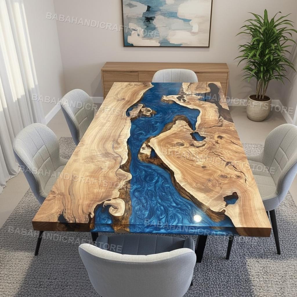 Tavolo da pranzo di lusso in resina epossidica blu oceano - Legno m...