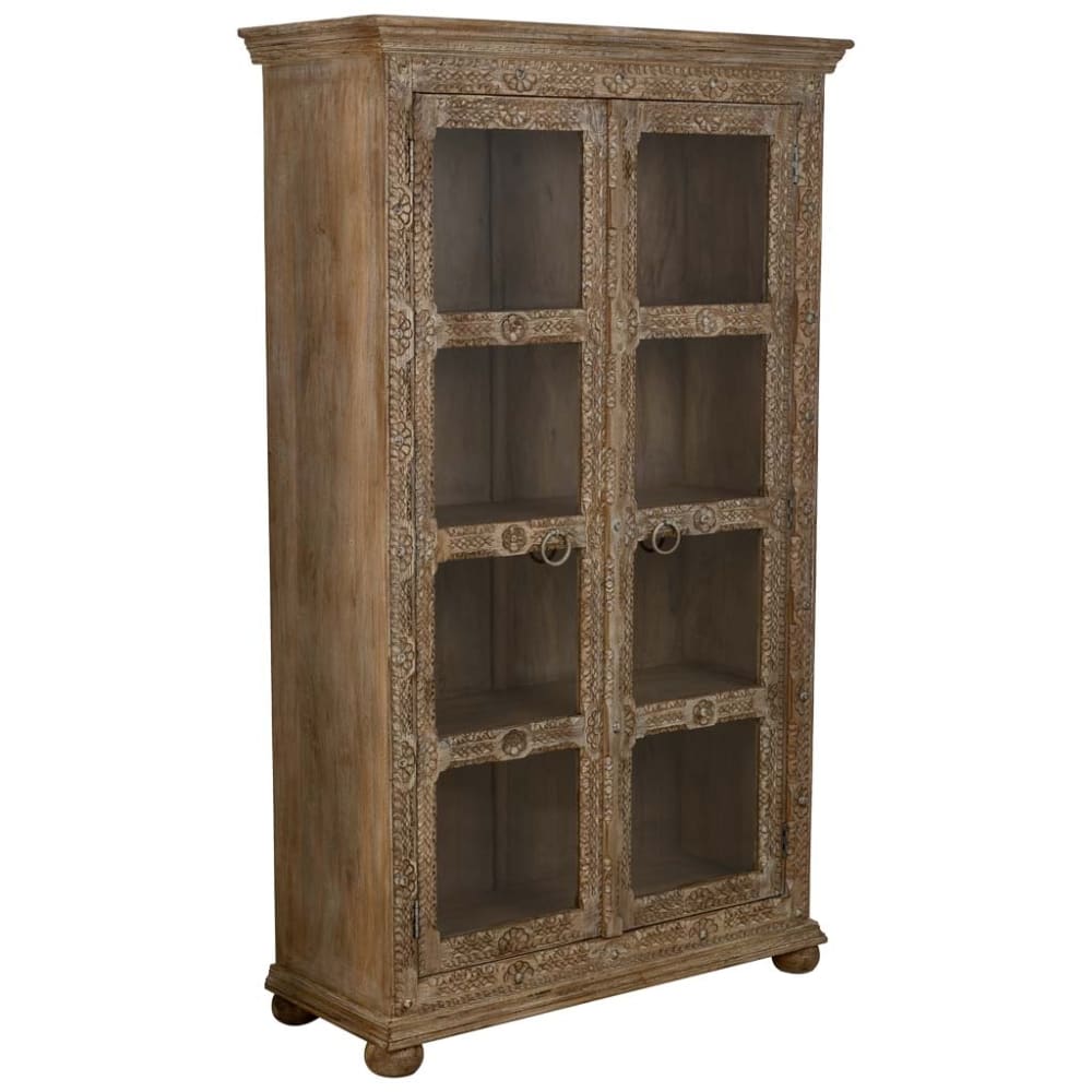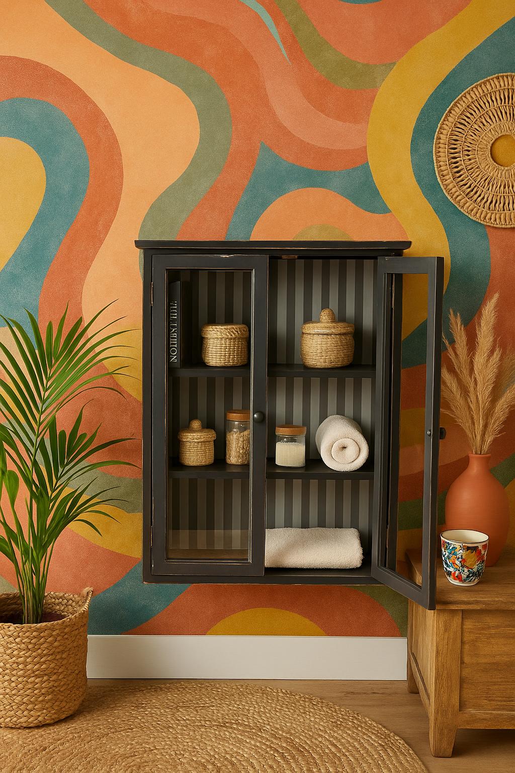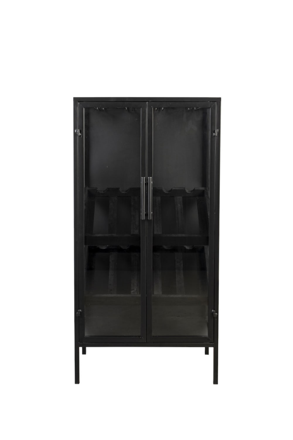 Il mobile Hazem è realizzato in pino nero con ante in vetro e una finitura leggermente patina...