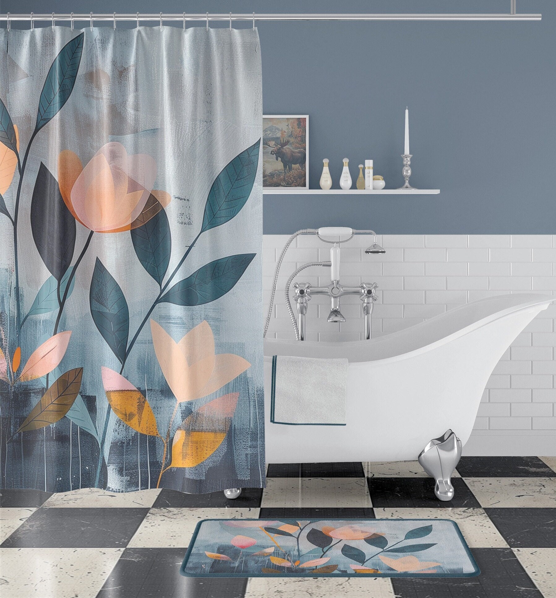 Tenda da doccia blu rosa Japandi tende da bagno astratte fiori rosa...