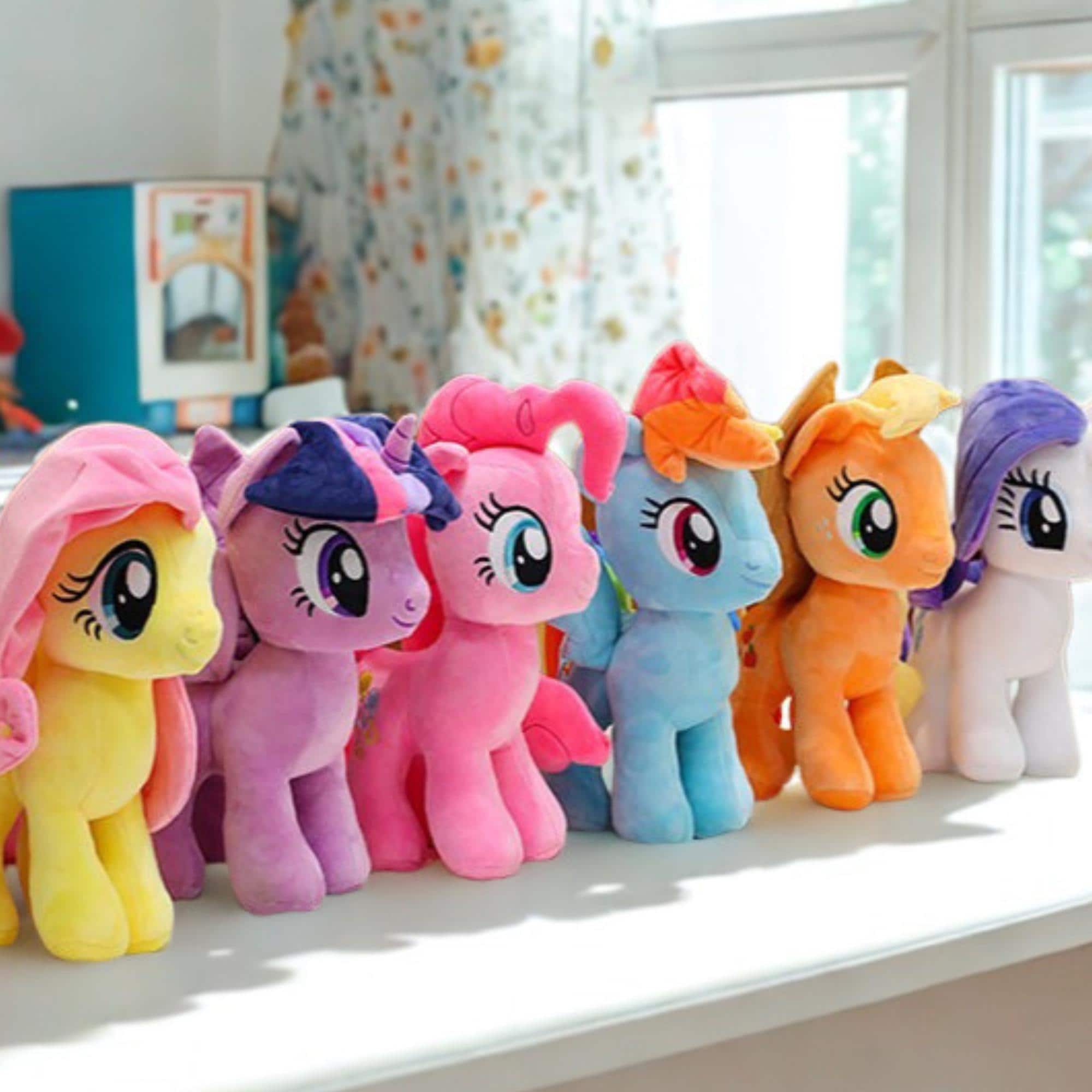 Un vivace set di peluche My Little Pony con diversi personaggi colorati, caratterizzati da tessuti m...