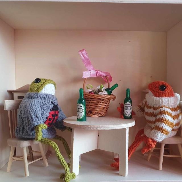Rane carine e adorabili ubriache sedute sul tavolo, giocattolo finito, piccola rana, giocattolo amig...