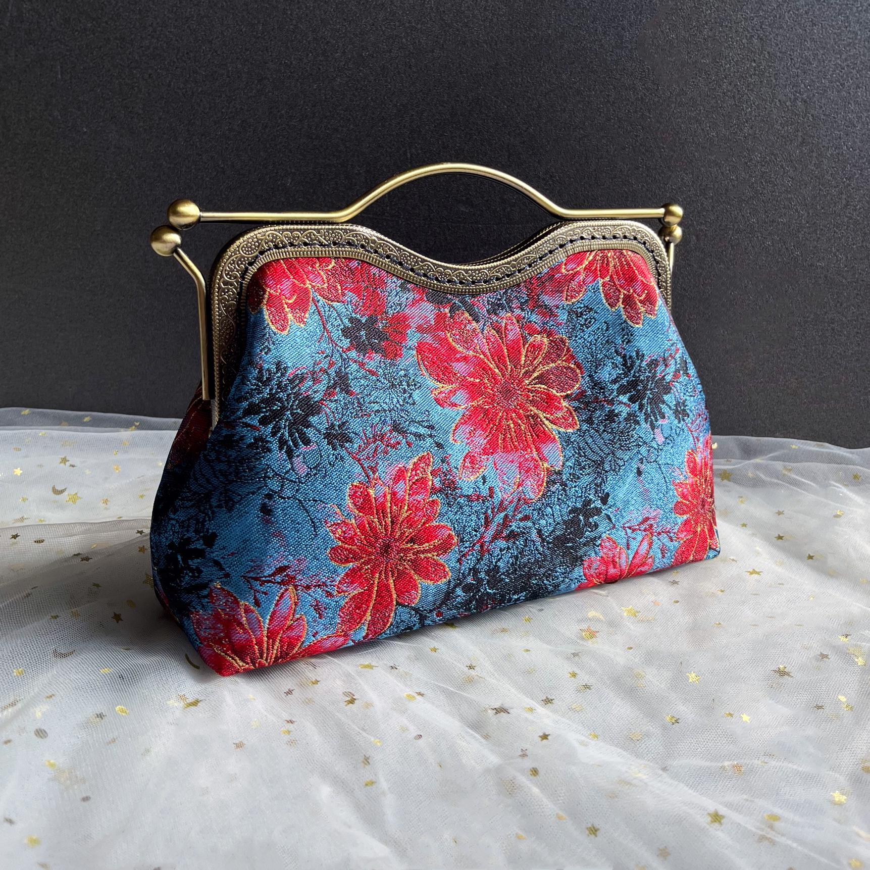 Red blue Handbag, Shoulder Bag, Evening Bag, Japanese Flower Print,...