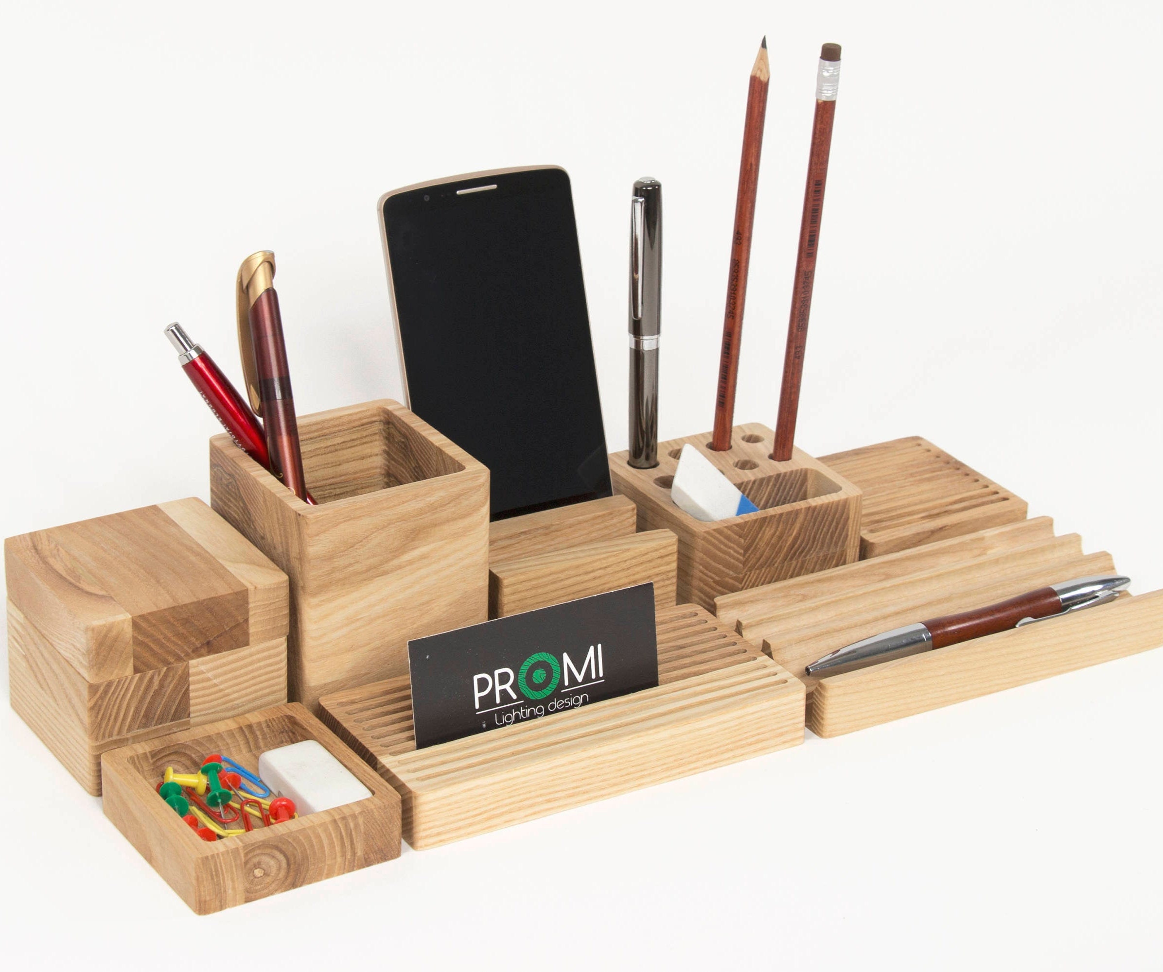 "Questo organizer da scrivania in legno dal design unico è composto da 1 piattaforma e 5...