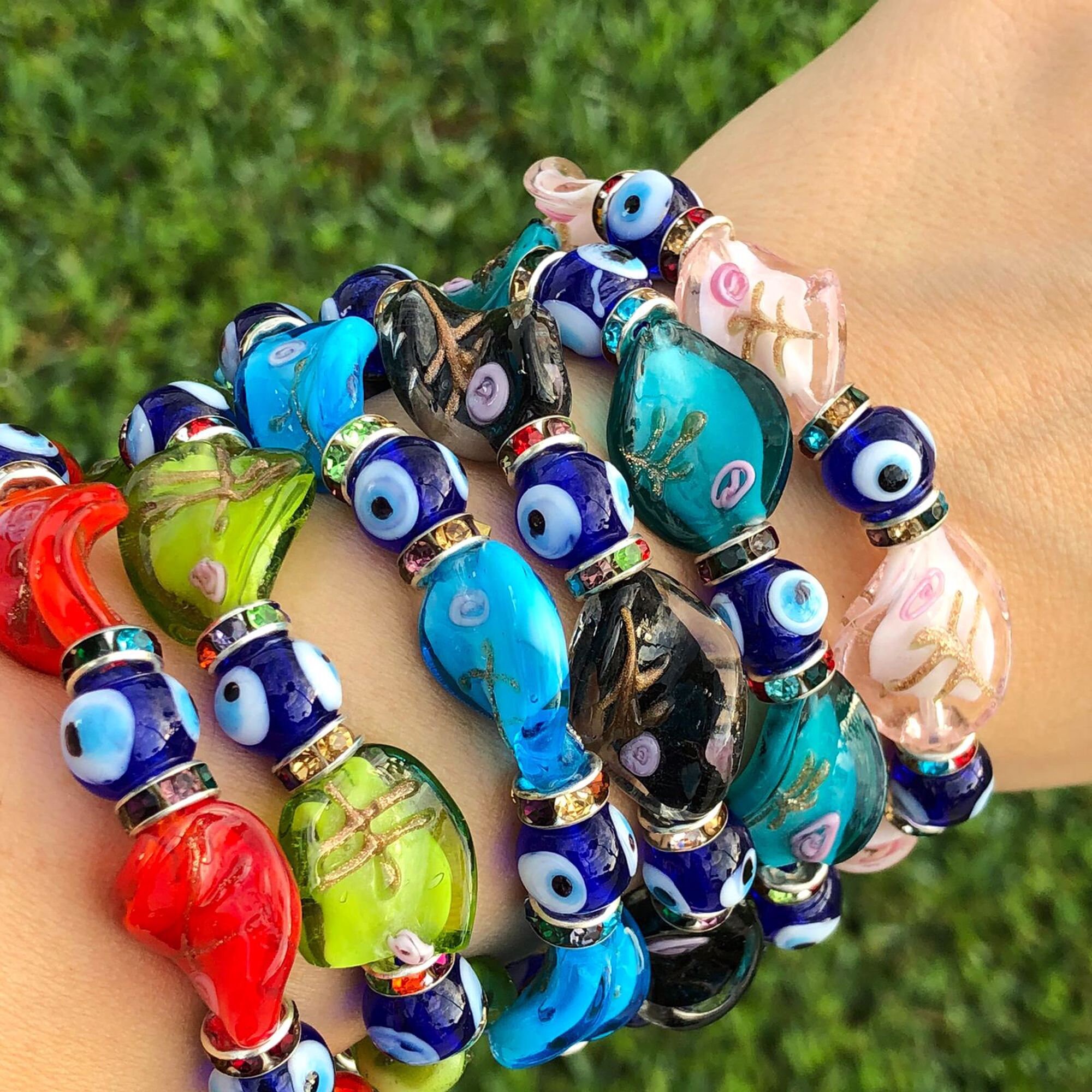 Bracciale, Bracciale con perline Evil Eye, Vetro dipinto a mano, St...