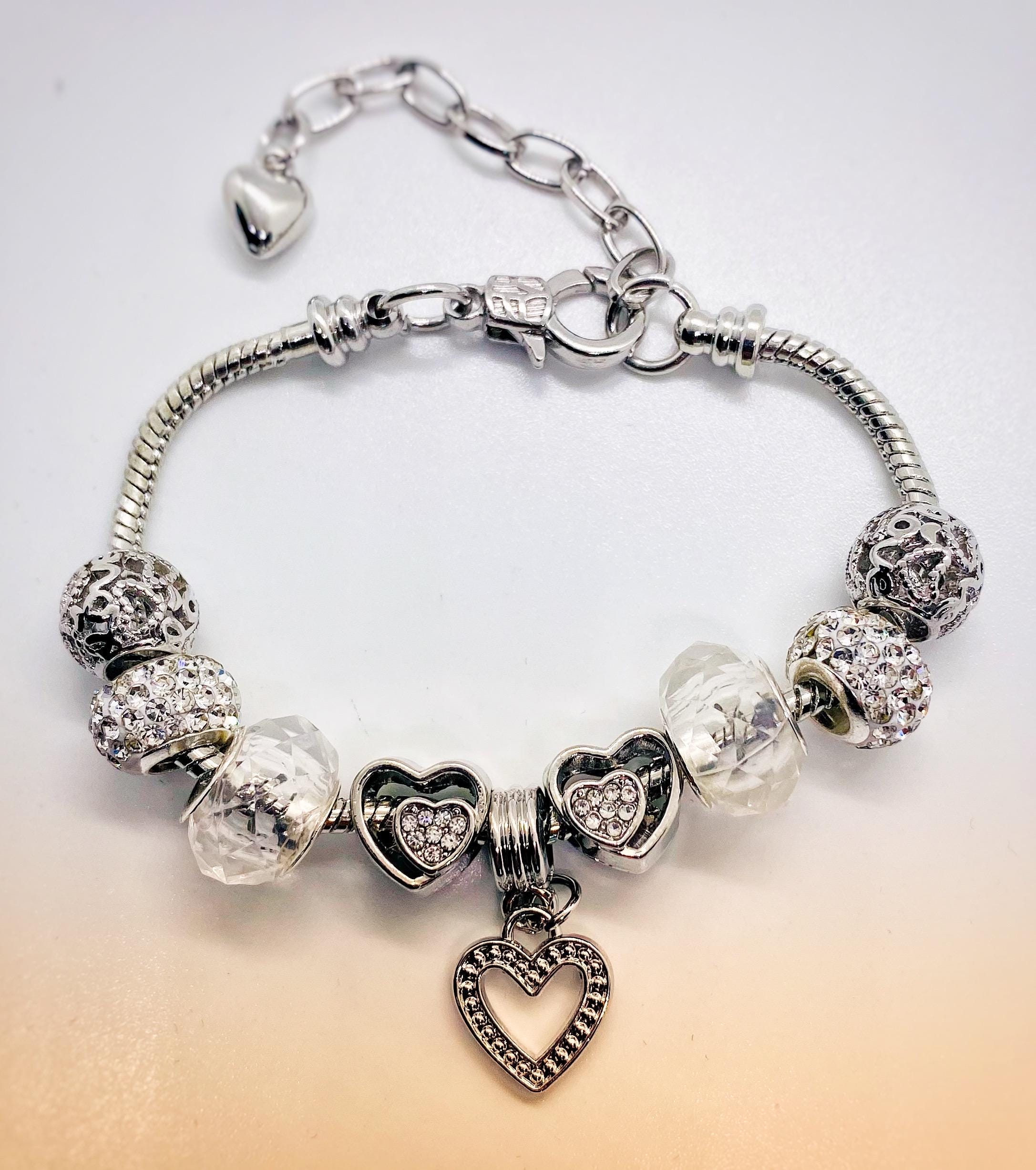 bracciale donna stile pandora, bracciale per lei, bracciale con charme a cuori, cuori di strass, bra...