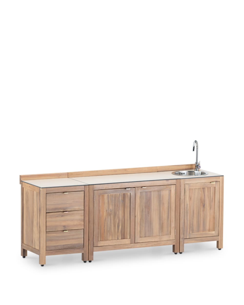 Set di 3 moduli in legno per cucina da esterno con lavello, 3 ante con ripiano interno e 3 cassettiS...