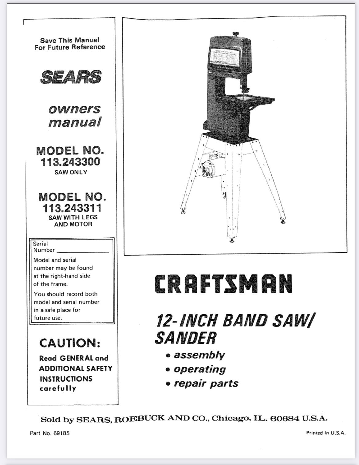 Proprietari di sega a nastro/levigatrice da 12 pollici artigiano Manuale di riparazione per operator...