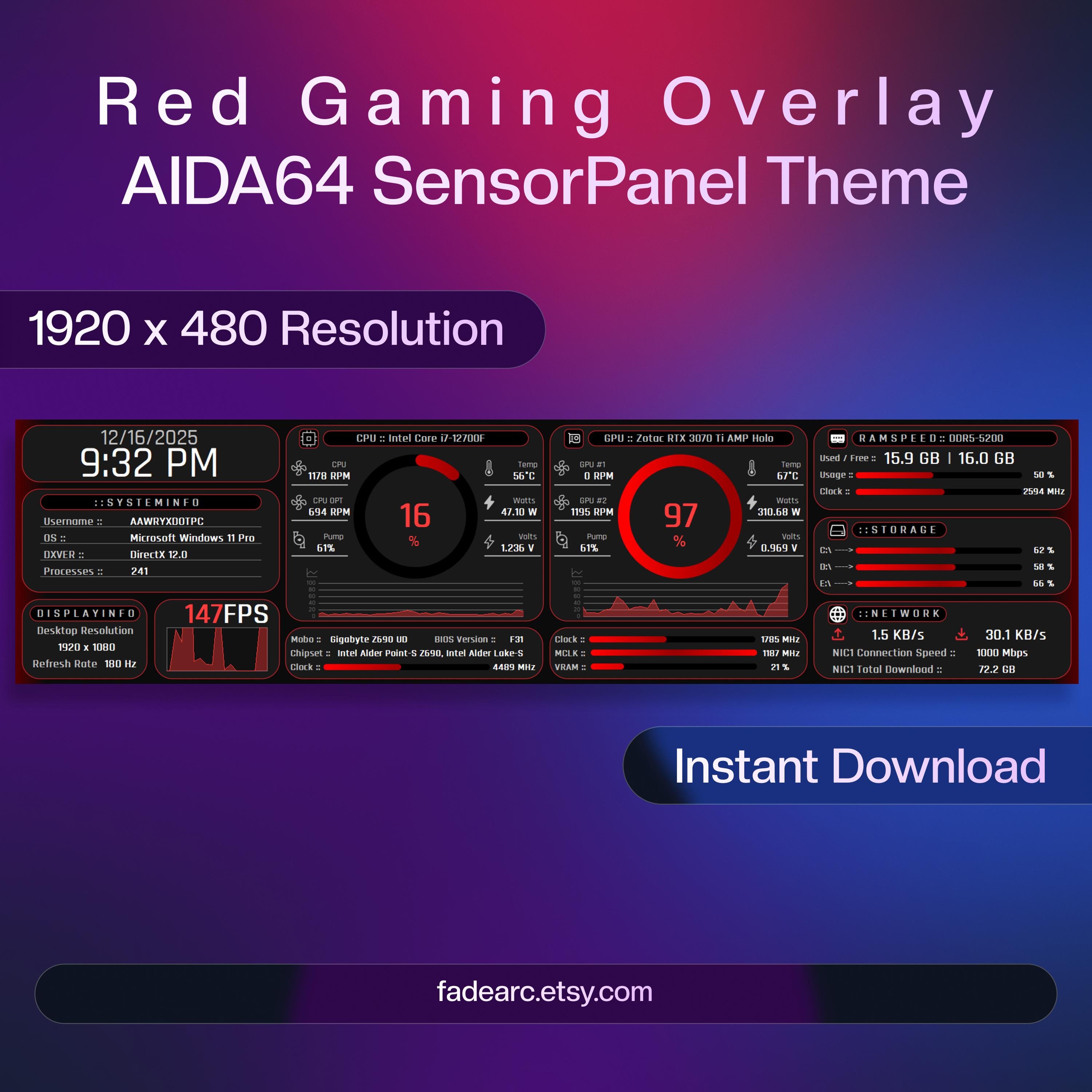 Pannello sensore AIDA64 Skin 1920x480 / Overlay gaming rosso / Disp...