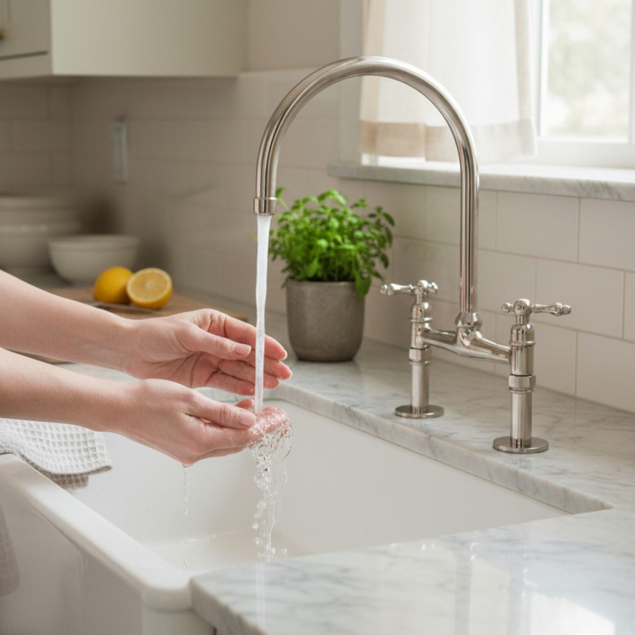 Rubinetto a ponte in ottone nichelato con gambe lineari e maniglie a leva per aggiungere un tocco di...