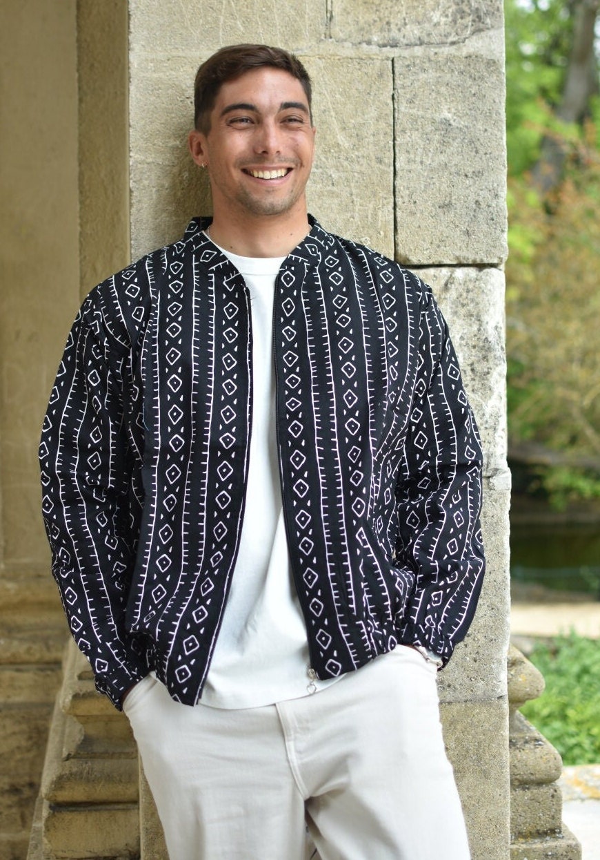 "Giubbotto bomber \"Aroun\" con stampa Bogolan Wax nera. Questa graziosa giacca &egra...