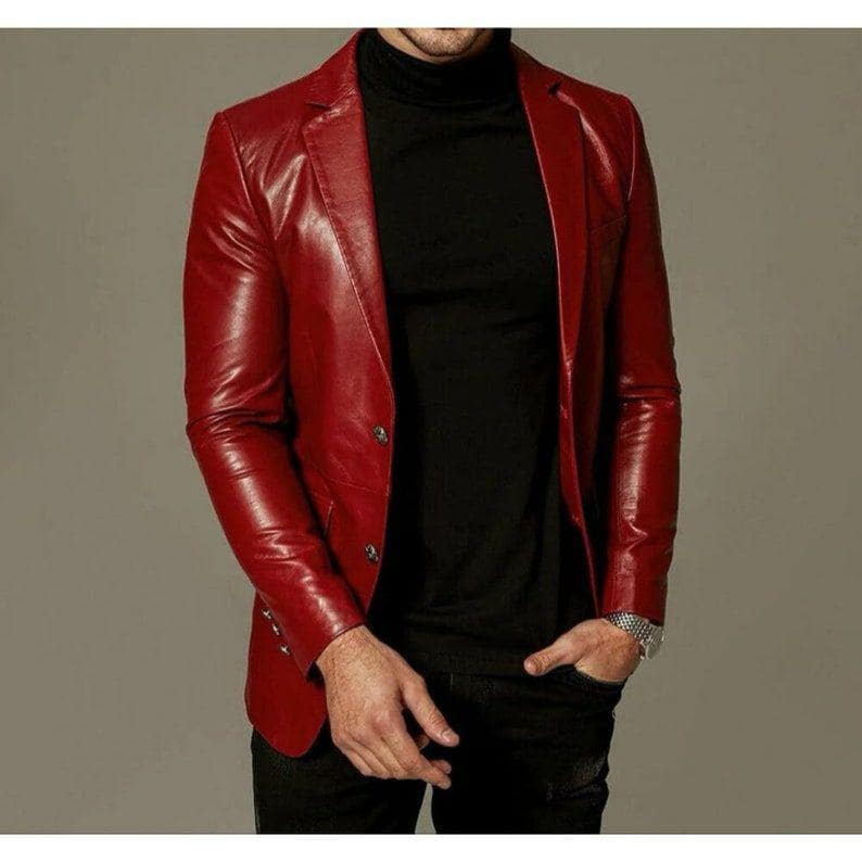 Blazer in pelle da uomo rosso sangue slim fit, cappotto in pelle ro...