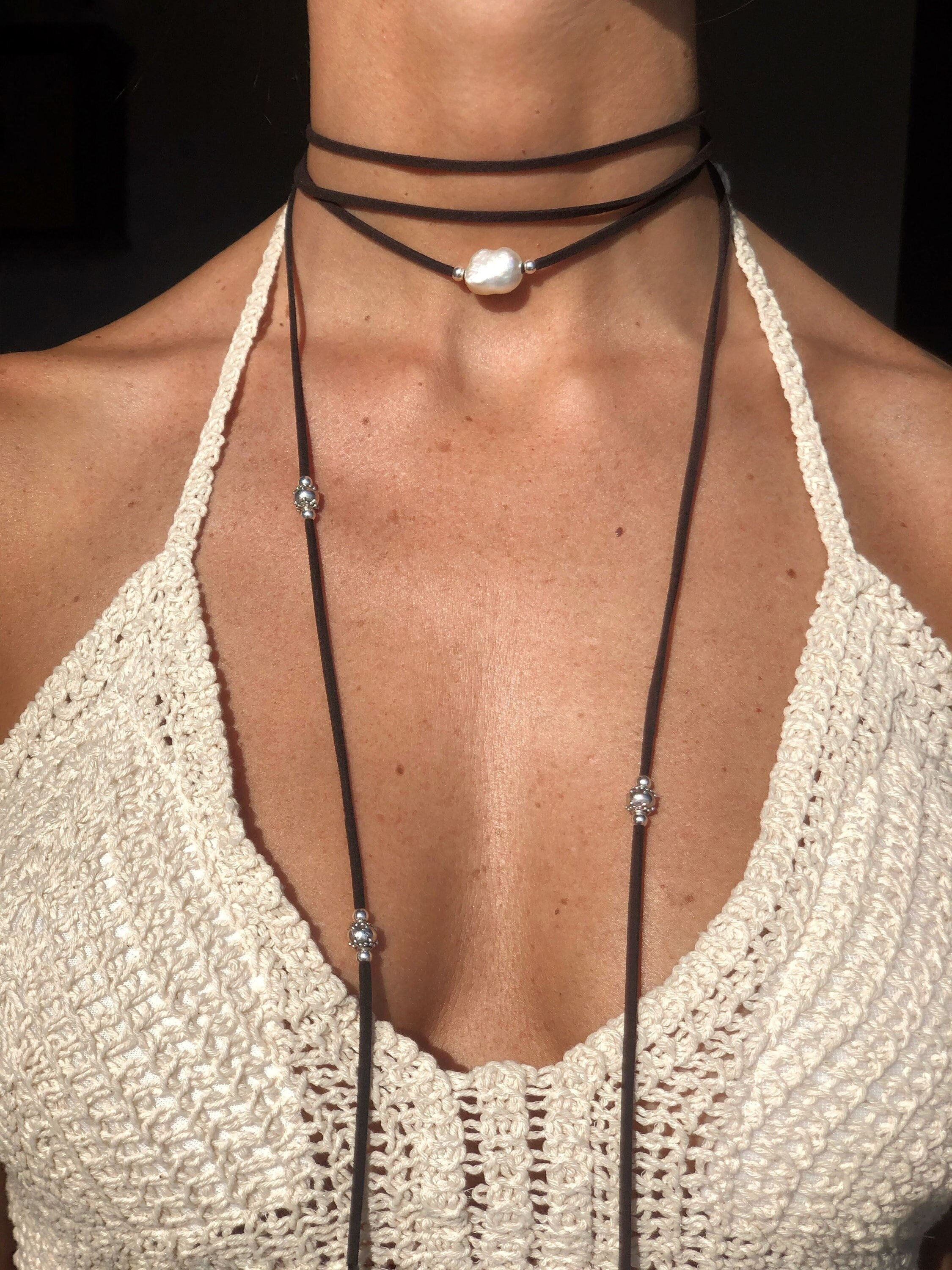 "Wrap Necklace Boho, Statement Bohemian Necklace, Long Leather Necklace with silver boho pendan...